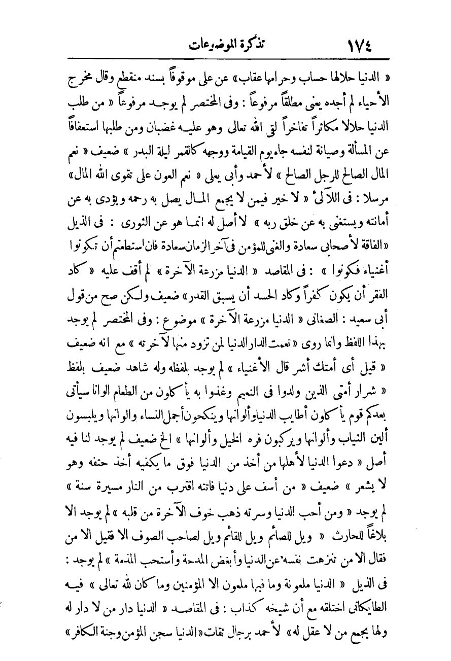 الصغاني «الدُّنْيَا مزرعة الْآخِرَة» مَوْضُوع، وَفِي الْمُخْتَصر لم يُوجد بِهَذَا اللَّفْظ وَإِنَّمَا رُوِيَ «نعمت الدَّار الدُّنْيَا لمن تزَود مِنْهَا لآخرته» مَعَ أَنه ضَعِيف «قيل أَي أمتك أشر؟ قَالَ الْأَغْنِيَاء» لم يُوجد بِلَفْظِهِ وَله شَاهد ضَعِيف بِلَفْظ.
