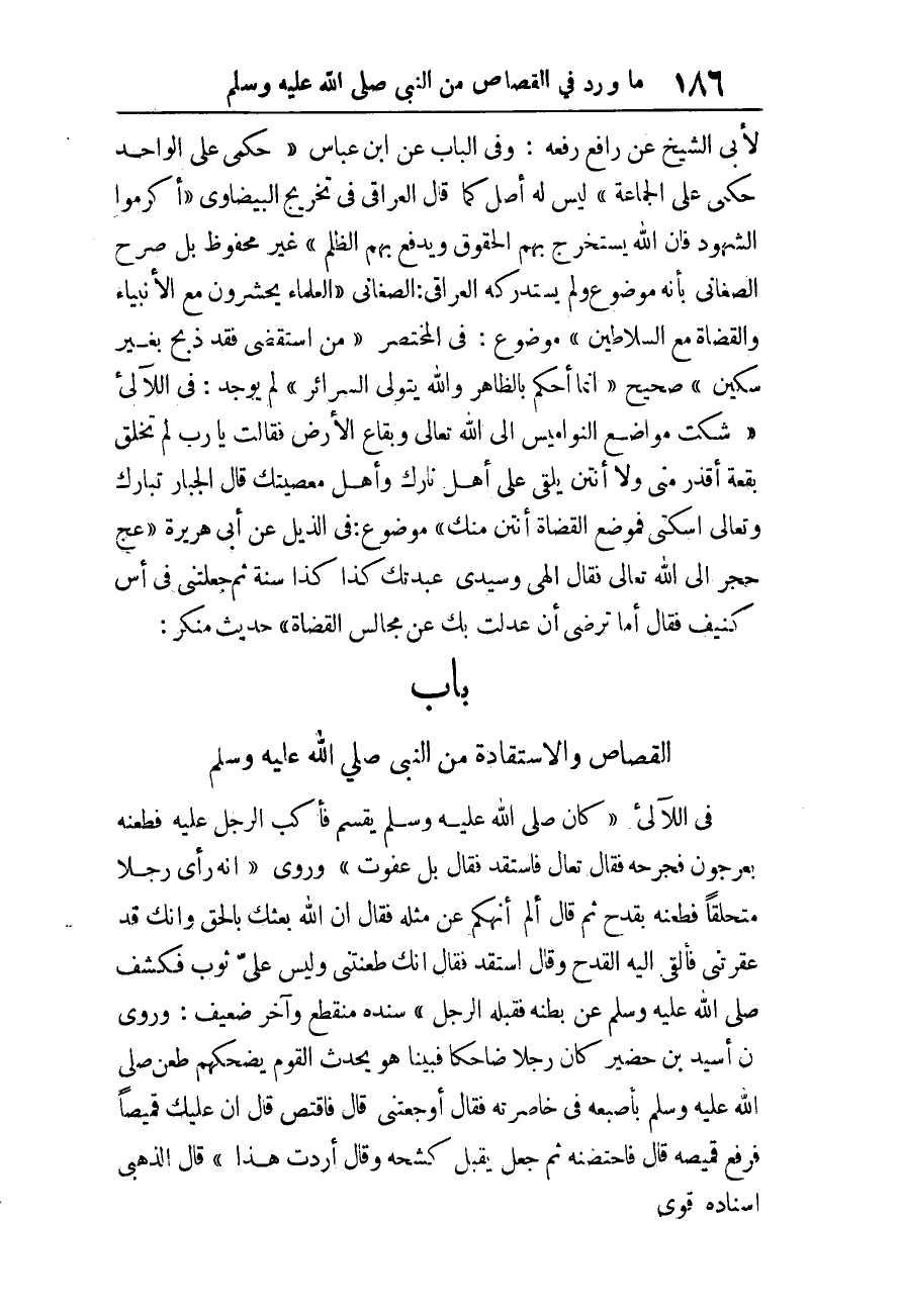 فِي اللآلئ «كَانَ صَلَّى اللَّهُ عَلَيْهِ وَسَلَّمَ يَقْسِمُ فَأَكَبَّ الرَّجُلُ عَلَيْهِ فَطَعَنَهُ بِعُرْجُونٍ فَجَرَحَهُ فَقَالَ تَعَالَ فَاسْتَقِدْ فَقَالَ بل عَفَوْت» وَرُوِيَ «أَنه رأى رجل متحلقا فطعنه بِقَدَحٍ ثُمَّ قَالَ أَلَمْ أَنْهَكُمْ عَنْ مِثْلِهِ فَقَالَ إِنَّ اللَّهَ بَعَثَكَ بِالْحَقِّ وَإِنَّكَ قَدْ عَقَرْتَنِي فَأَلْقَى إِلَيْهِ الْقَدَحَ وَقَالَ اسْتَقِدْ فَقَالَ إِنَّكَ طَعَنْتَنِي وَلَيْسَ عَلَيَّ ثَوْبٌ فَكَشَفَ صَلَّى اللَّهُ عَلَيْهِ وَسَلَّمَ عَنْ بَطْنِهِ فَقَبَّلَهُ الرَّجُلُ» سَنَده مُنْقَطع وَآخر ضَعِيف، وَرُوِيَ عَن أسيد بن حضير كَانَ رجلا ضَاحِكا فَبَيْنَمَا هُوَ يحدث الْقَوْم يضحكهم طعن صلى الله عَلَيْهِ وَسلم بإصبعه فِي خاصرته فَقَالَ أوجعتني قَالَ فاقتص قَالَ إِن عَلَيْك قَمِيصًا فَرفع قَمِيصه قَالَ فَاحْتَضَنَهُ ثمَّ جعل يقبل كشحه وَقَالَ أردْت هَذَا" قَالَ الذَّهَبِيّ إِسْنَاده قوي.