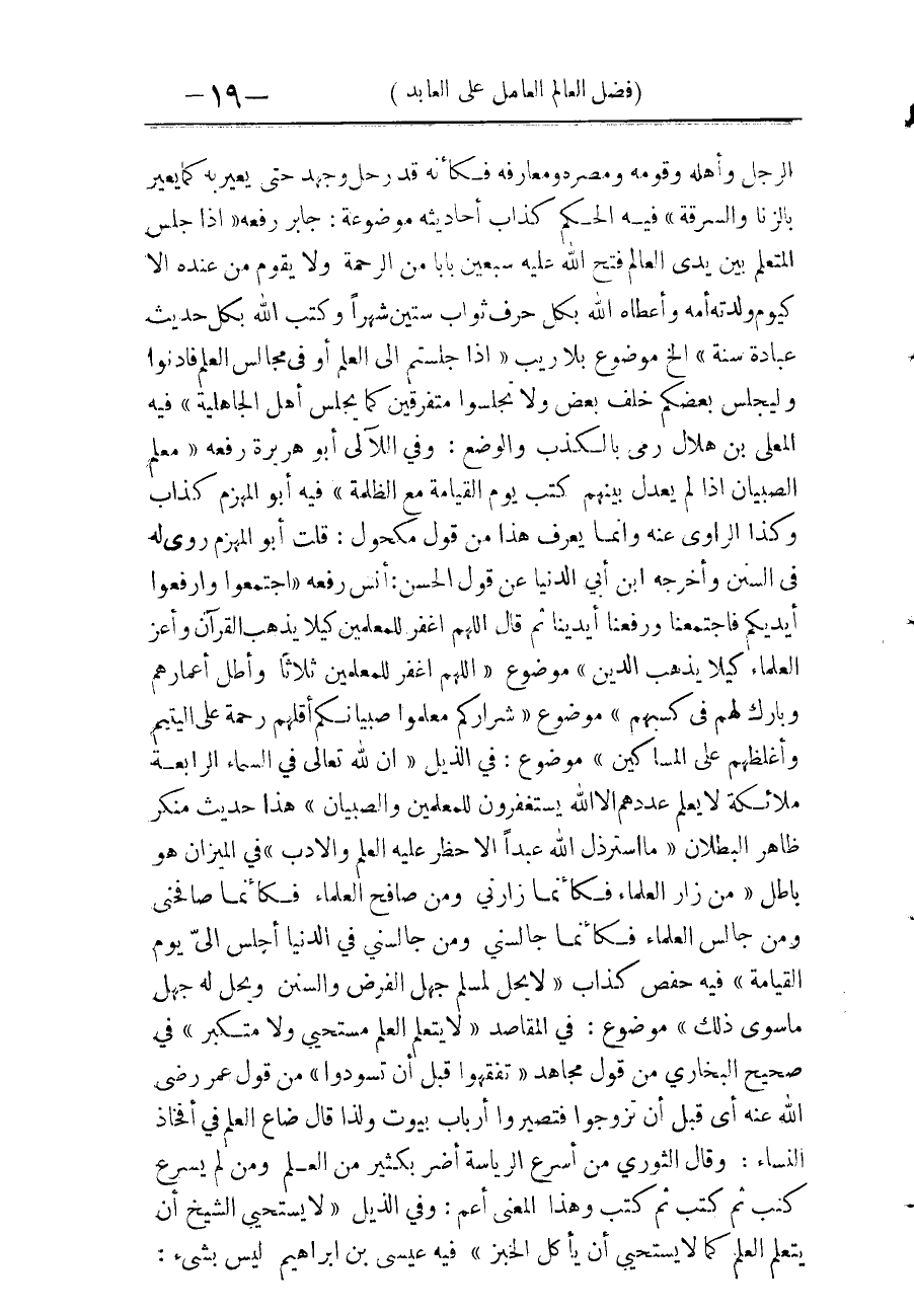 جَابر رَفعه «إِذَا جَلَسَ الْمُتَعَلِّمُ بَيْنَ يَدَيِ الْعَالِمِ فَتَحَ اللَّهُ عَلَيْهِ سَبْعِينَ بَابًا مِنَ الرَّحْمَةِ وَلا يَقُومُ مِنْ عِنْدِهِ إِلا كَيَوْمِ وَلَدَتْهُ أُمُّهُ وَأَعْطَاهُ اللَّهُ بِكُلِّ حَرْفٍ ثَوَابَ سِتِّينَ شَهْرًا وَكَتَبَ اللَّهُ بِكُل حَدِيث عبَادَة سنة» إِلَخ. مَوْضُوع بِلَا ريب.
