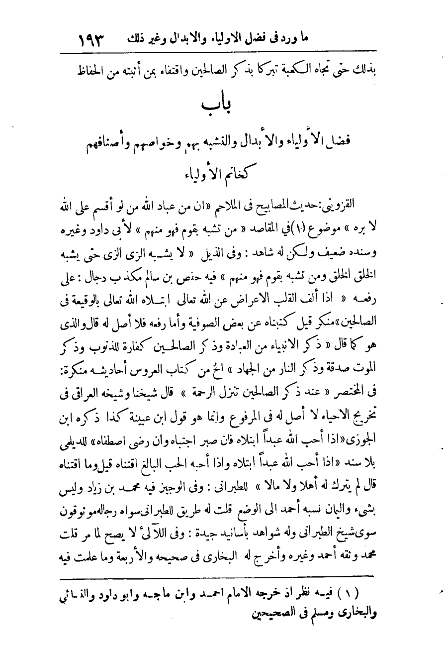 بَابُ فَضْلِ الأَوْلِيَاءِ وَالأَبْدَالِ وَالتَّشَبُّهِ بِهِمْ وَخَوَاصِّهِمْ وَأَصْنَافِهِمْ كَخَاتَمِ الأَوْلِيَاءِ.