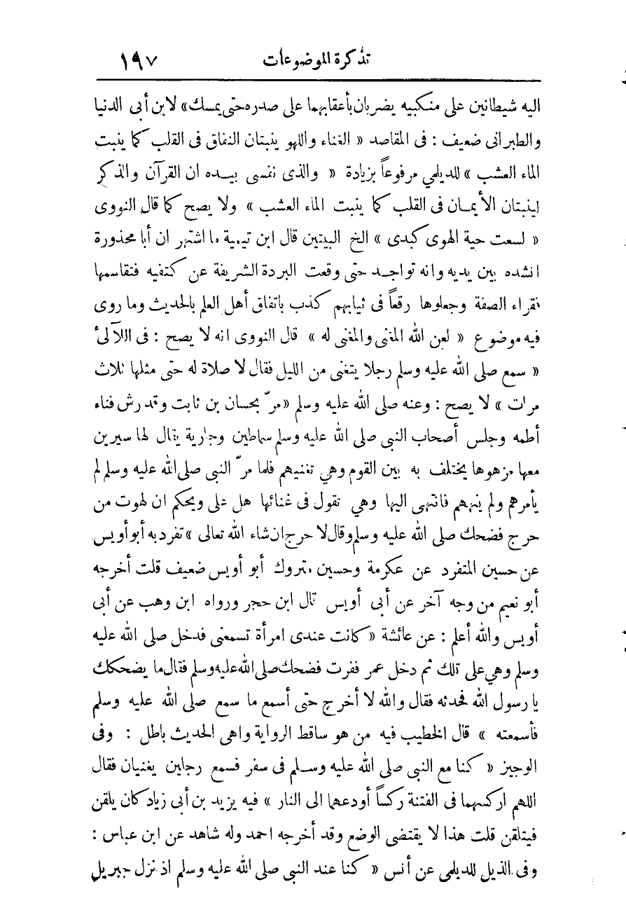 وَفِي الْوَجِيز «كُنَّا مَعَ النَّبِيِّ صَلَّى اللَّهُ عَلَيْهِ وَسَلَّمَ فِي سَفَرٍ فَسَمِعَ رَجُلَيْنِ يُغَنِّيَانِ فَقَالَ اللَّهُمَّ ارْكُسْهُمَا فِي الْفِتْنَةِ رَكْسًا أَوْ دَعْهُمَا إِلَى النَّار» فِيهِ يزِيد بن أبي زِيَاد كَانَ يلقن فيتلقن قلت هَذَا لَا يَقْتَضِي الْوَضع وَقد أخرجه أَحْمد وَله شَاهد عَن ابْن عَبَّاس، وَفِي الذيل للديلمي عَن أنس «كُنَّا عِنْدَ النَّبِيِّ صَلَّى اللَّهُ عَلَيْهِ وَسَلَّمَ إِذْ نَزَلَ جِبْرِيلُ