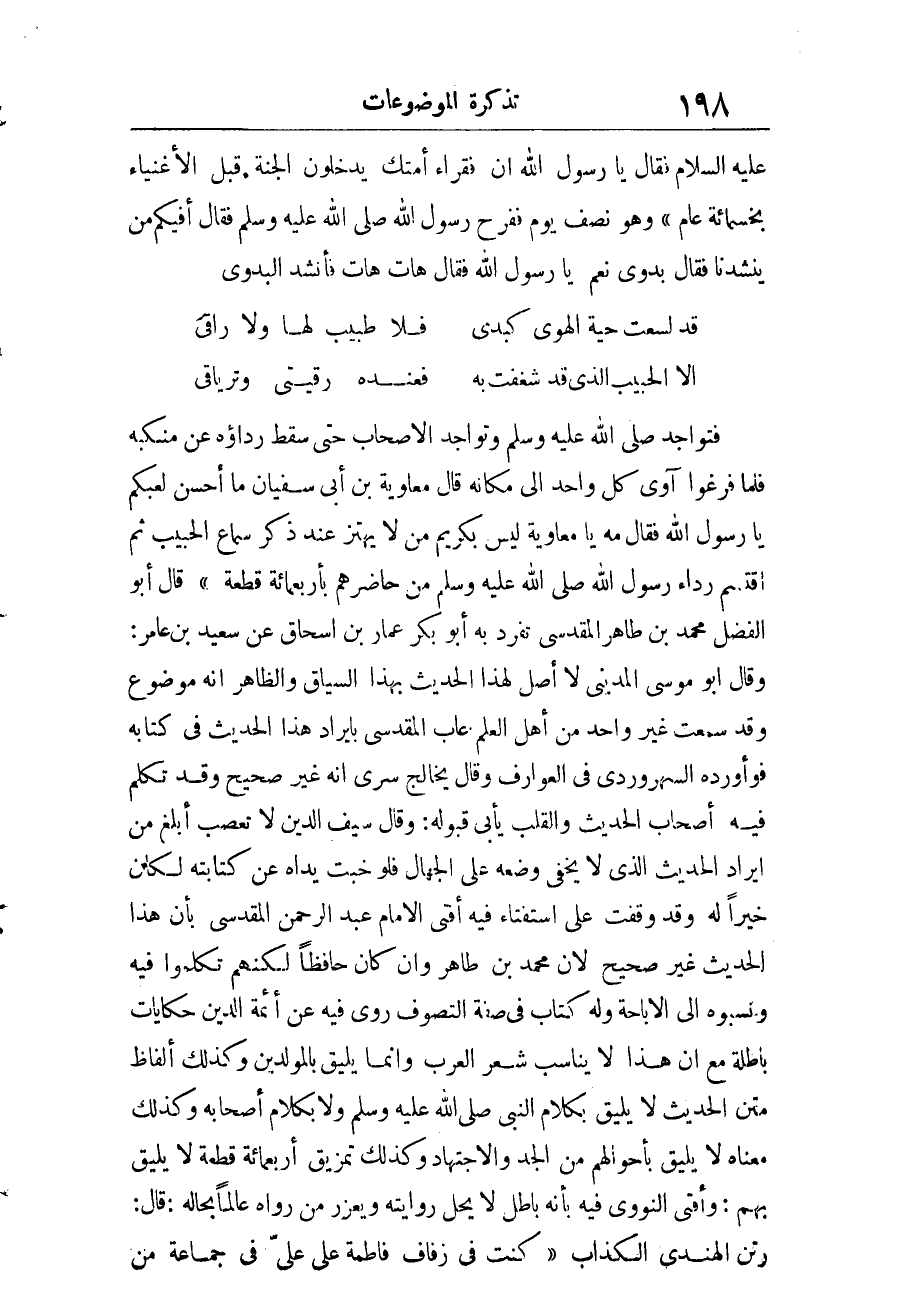 فَتَوَاجَدَ صَلَّى اللَّهُ عَلَيْهِ وَسَلَّمَ وَتَوَاجَدَ الأصْحَابُ حَتَّى سَقَطَ رِدَاؤُهُ عَنْ مَنْكِبِهِ فَلَمَّا فَرَغُوا آوَى كُلُّ وَاحِدٍ إِلَى مَكَانِهِ قَالَ مُعَاوِيَةُ بْنُ أَبِي سُفْيَانَ مَا أَحْسَنَ لَعِبَكُمْ يَا رَسُولَ اللَّهِ فَقَالَ مَهْ يَا مُعَاوِيَةُ لَيْسَ بِكَرِيمٍ مَنْ لَا يَهْتَزُّ عِنْدَ ذكر سَماع الحبيب ثمَّ اقتسم رِدَاءَ رَسُولِ اللَّهِ صَلَّى اللَّهُ عَلَيْهِ وَسلم من حاضرهم بأربعمائة قِطْعَة" قَالَ أَبُو الْفضل مُحَمَّد بن طَاهِر الْمَقْدِسِي تفرد بِهِ أَبُو بكر عمار بن إِسْحَاق عَن سعيد بن عَامر، وَقَالَ أَبُو مُوسَى الْمَدِينِيّ لَا أصل لهَذَا الحَدِيث بِهَذَا السِّيَاق وَالظَّاهِر أَنه مَوْضُوع وَقد سَمِعت غير وَاحِد من أهل الْعلم عَابَ الْمَقْدِسِي بإيراد هَذَا الحَدِيث فِي كِتَابه وَأوردهُ السهروردي فِي العوارف وَقَالَ يخالج سري أَنه غير صَحِيح وَقد تكلم فِيهِ أَصْحَاب الحَدِيث وَالْقلب يَأْبَى قبُوله، وَقَالَ سيف الدَّين لَا تعصب أبلغ من إِيرَاد الحَدِيث الَّذِي لَا يخفى وَضعه على الْجُهَّال فَلَو خبت يَدَاهُ عَن كِتَابَته لَكَانَ خيرا لَهُ وَقد وقفت على استفتاء فِيهِ أفتى الإِمَام عبد الرَّحْمَن الْمَقْدِسِي بِأَن هَذَا الحَدِيث غير صَحِيح لِأَن مُحَمَّد بن طَاهِر وَإِن كَانَ حَافِظًا لكِنهمْ تكلمُوا فِيهِ ونسبوه إِلَى الْإِبَاحَة وَله كتاب فِي صفة التصوف روى فِيهِ عَن أَئِمَّة الدَّين حكايات بَاطِلَة مَعَ أَن هَذَا لَا يُنَاسب شعر الْعَرَب وَإِنَّمَا يَلِيق بالمولدين وَكَذَلِكَ أَلْفَاظ متن الحَدِيث لَا يَلِيق بِكَلَام النَّبِيِّ صَلَّى اللَّهُ عَلَيْهِ وَسَلَّمَ وَلَا بِكَلَام أَصْحَابه وَكَذَلِكَ مَعْنَاهُ لَا يَلِيق بأحوالهم من الْجد وَالِاجْتِهَاد وَكَذَلِكَ تمزيق أَرْبَعمِائَة قِطْعَة لَا يَلِيق بهم، وَأفْتى النَّوَوِيّ فِيهِ بِأَنَّهُ بَاطِل لَا يحل رِوَايَته وَيُعَزر من رَوَاهُ عَالما بِحَالهِ.