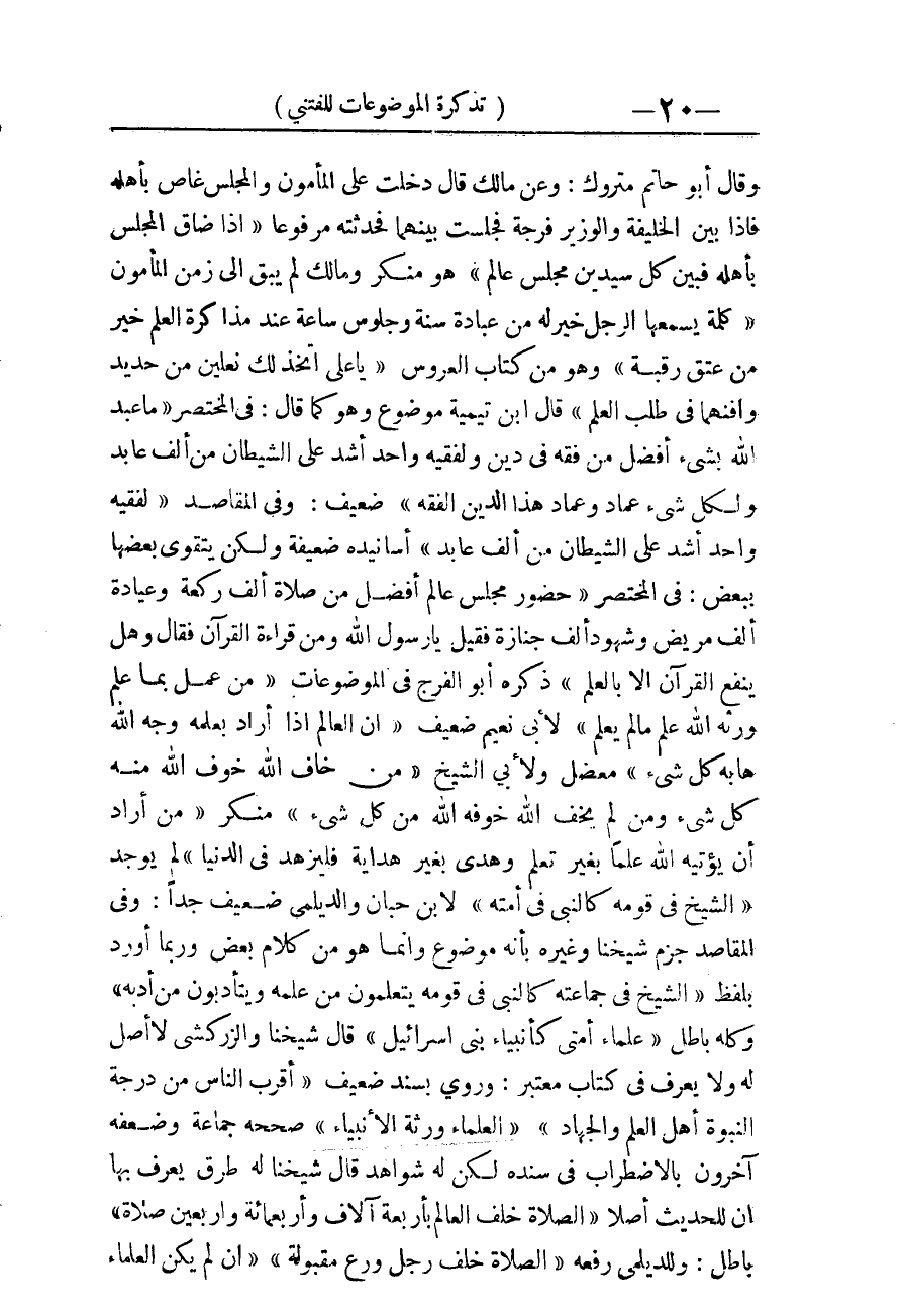 فِي الْمُخْتَصر «حُضُورُ مَجْلِسِ عَالِمٍ أَفْضَلُ مِنْ صَلاةِ أَلْفِ رَكْعَةٍ وَعِيَادَةِ أَلْفِ مَرِيضٍ وَشُهُودِ أَلْفِ جَنَازَةٍ فَقِيلَ يَا رَسُولَ اللَّهِ وَمِنْ قِرَاءَةِ الْقُرْآنِ فَقَالَ وَهَلْ يَنْفَعُ الْقُرْآنُ إِلَّا بِالْعلمِ» ذكره أَبُو الْفرج فِي الموضوعات.
