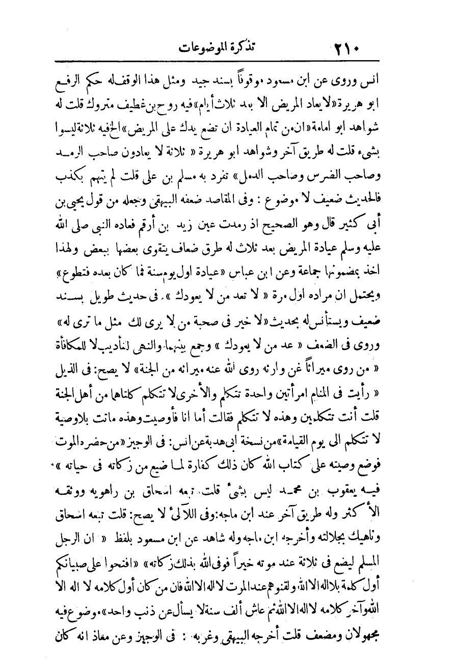 أَبُو هُرَيْرَة «ثَلاثَةٌ لَا يُعَادُونَ صَاحِبُ الرَّمَدِ وَصَاحب الضرس وَصَاحب الدمل» تفرد بِهِ مُسلم بن عَليّ قلت لم يتهم بكذب فَالْحَدِيث ضَعِيف لَا مَوْضُوع، وَفِي الْمَقَاصِد ضعفه الْبَيْهَقِيّ وَجعله من قَول يحيى بن أبي كثير قَالَ وَهُوَ الصَّحِيح إِذْ رمدت عين زيد بن أَرقم فعاده النَّبِيِّ صَلَّى اللَّهُ عَلَيْهِ وَسَلَّمَ. عِيَادَة الْمَرِيض بعد ثَلَاث لَهُ طرق ضِعَاف يتقوى بَعْضهَا بِبَعْض وَلِهَذَا أَخذ بمضمونها جمَاعَة وَعَن ابْن عَبَّاس «عِيَادَة أول يَوْم سنة فَمَا كَانَ بعده فتطوع» وَيحْتَمل أَن مُرَاده أول مرّة.
