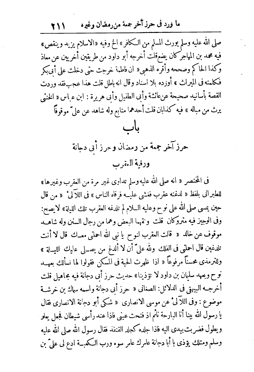 بَاب حرز آخر جُمُعَة من رَمَضَان وحرز أبي دُجَانَة ورقية الْعَقْرَب.