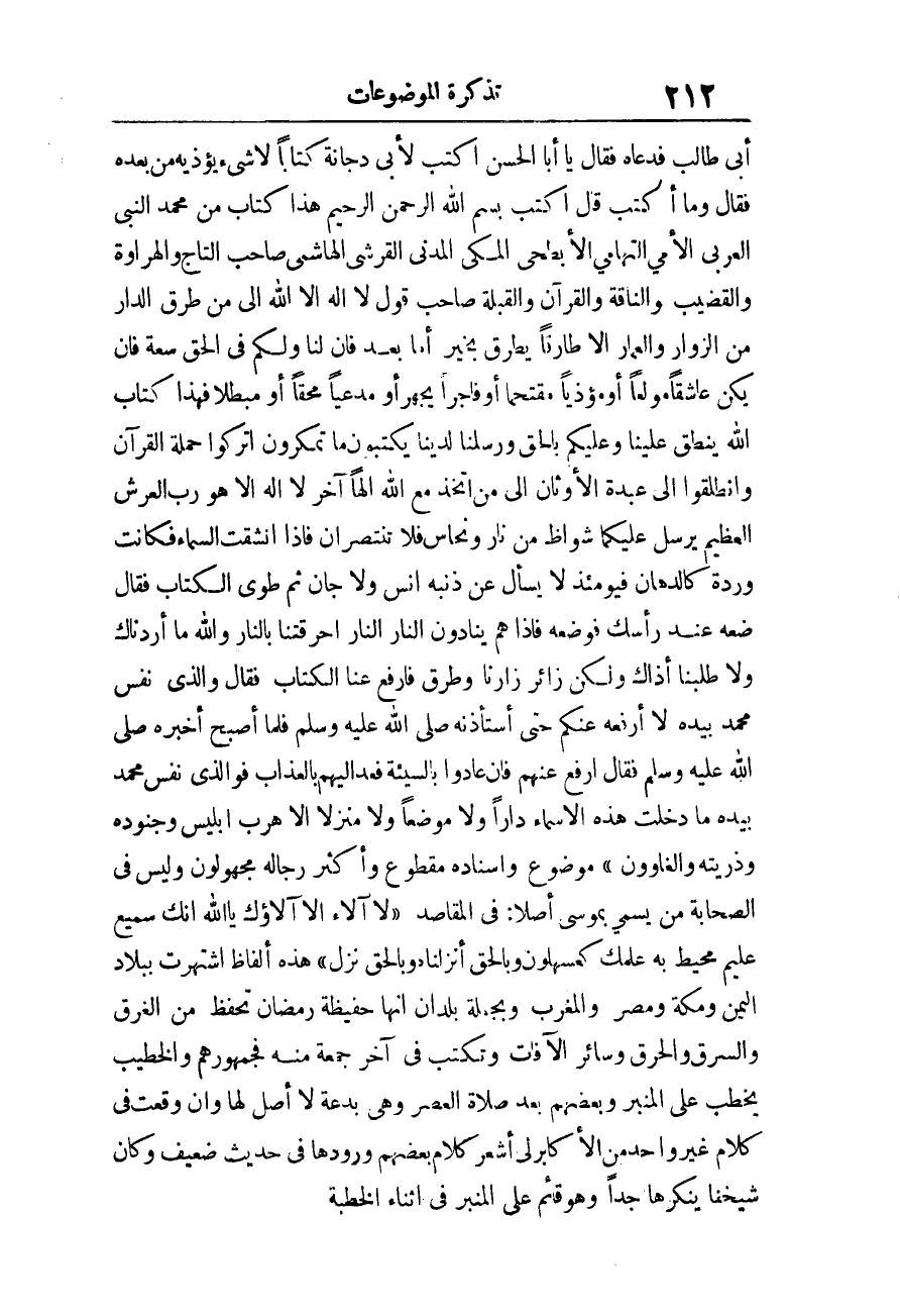 أبي طَالب فَدَعَاهُ فَقَالَ يَا أَبَا الْحَسَنِ اكْتُبْ لأَبِي دُجَانَةَ كِتَابًا لَا شَيْءَ يُؤْذِيهِ مِنْ بَعْدِهِ فَقَالَ وَمَا أَكْتُبُ قَالَ اكْتُبْ بِسْمِ اللَّهِ الرَّحْمَنِ الرَّحِيمِ هَذَا كِتَابٌ مِنْ مُحَمَّدٍ النَّبِيِّ الْعَرَبِيِّ الأُمِّيِّ التِّهَامِيِّ الأَبْطَحِيِّ الْمَكِّيِّ الْمَدَنِيِّ الْقُرَشِيِّ الْهَاشِمِيِّ صَاحِبِ التَّاجِ وَالْهِرَاوَةِ وَالْقَضِيبِ وَالنَّاقَةِ وَالْقُرْآنِ وَالْقِبْلَةِ صَاحِبِ قَوْلِ لَا إِلَهَ إِلا اللَّهُ إِلَى مَنْ طَرَقَ الدَّارَ مِنَ الزُّوَّارِ وَالْعُمَّارِ إِلا طَارِقًا يَطْرُقُ بِخَيْرٍ أَمَّا بَعْدُ فَإِنَّ لَنَا وَلَكُمْ فِي الْحَقِّ سَعَةً فَإِنْ يَكُنْ عَاشِقًا مُولَعًا أَوْ مُؤْذِيًا مُقْتَحِمًا أَوْ فَاجِرًا يَجْهَرُ أَوْ مُدَّعِيًا مُحِقًّا أَوْ مُبْطِلا فَهَذَا كِتَابُ اللَّهِ يَنْطِقُ عَلَيْنَا وَعَلَيْكُمْ بِالْحَقِّ وَرُسُلُنَا لَدَيْنَا يَكْتُبُونَ مَا تَمْكُرُونَ اتْرُكُوا حَمَلَةَ الْقُرْآنِ وَانْطَلِقُوا إِلَى عَبْدَةِ الأَوْثَانِ إِلَى مَنِ اتَّخَذَ مَعَ اللَّهِ إِلَهًا آخَرَ لَا إِلَهَ إِلا هُوَ رَبُّ الْعَرْشِ الْعَظِيمِ يُرْسَلُ عَلَيْكُمَا شُوَاظٌ مِنْ نَارٍ وَنُحَاسٌ فَلا تَنْتَصِرَانِ فَإِذَا انْشَقَّتِ السَّمَاءُ فَكَانَتْ وَرَدَةً كَالدِّهَانِ فَيَوْمَئِذٍ لَا يُسْأَلُ عَنْ ذَنْبِهِ إِنْسٌ وَلا جَانٌّ ثُمَّ طَوَى الْكِتَابَ فَقَالَ ضَعْهُ عِنْدَ رَأْسِكَ فَوَضَعَهُ فَإِذَا هُمْ يُنَادُونَ النَّارَ النَّارَ أَحْرَقْتَنَا بِالنَّارِ وَاللَّهِ مَا أَرَدْنَاكَ وَلا طَلَبْنَا أَذَاكَ وَلَكِنْ زَائِرٌ زَارَنَا وَطَرَقَ فَارْفَعْ عَنَّا الْكِتَابَ فَقَالَ وَالَّذِي نَفْسُ مُحَمَّدٍ بِيَدِهِ لَا أَرْفَعُهُ عَنْكُمْ حَتَّى أَسْتَأْذِنَهُ صَلَّى اللَّهُ عَلَيْهِ وَسَلَّمَ فَلَمَّا أَصْبَحَ أَخْبَرَهُ صَلَّى اللَّهُ عَلَيْهِ وَسَلَّمَ فَقَالَ ارْفَعْ عَنْهُمْ فَإِنْ عَادُوا بِالسَّيِّئَةِ فَعُدْ إِلَيْهِمْ بِالْعَذَابِ فَوَالَّذِي نَفْسُ مُحَمَّدٍ بِيَدِهِ مَا دَخَلَتْ هَذِهِ الأسْمَاءُ دَارًا وَلا مَوْضِعًا وَلا مَنْزِلا إِلا هَرَبَ إِبْلِيسُ وَجُنُودُهُ وَذُرِّيَّتُهُ وَالْغَاوُونَ» مَوْضُوعٌ وَإِسْنَادُهُ مَقْطُوعٌ وَأَكْثَرُ رِجَالِهِ مَجْهُولُونَ وَلَيْسَ فِي الصَّحَابَةِ مَنْ يُسمى بمُوسَى أصلا.