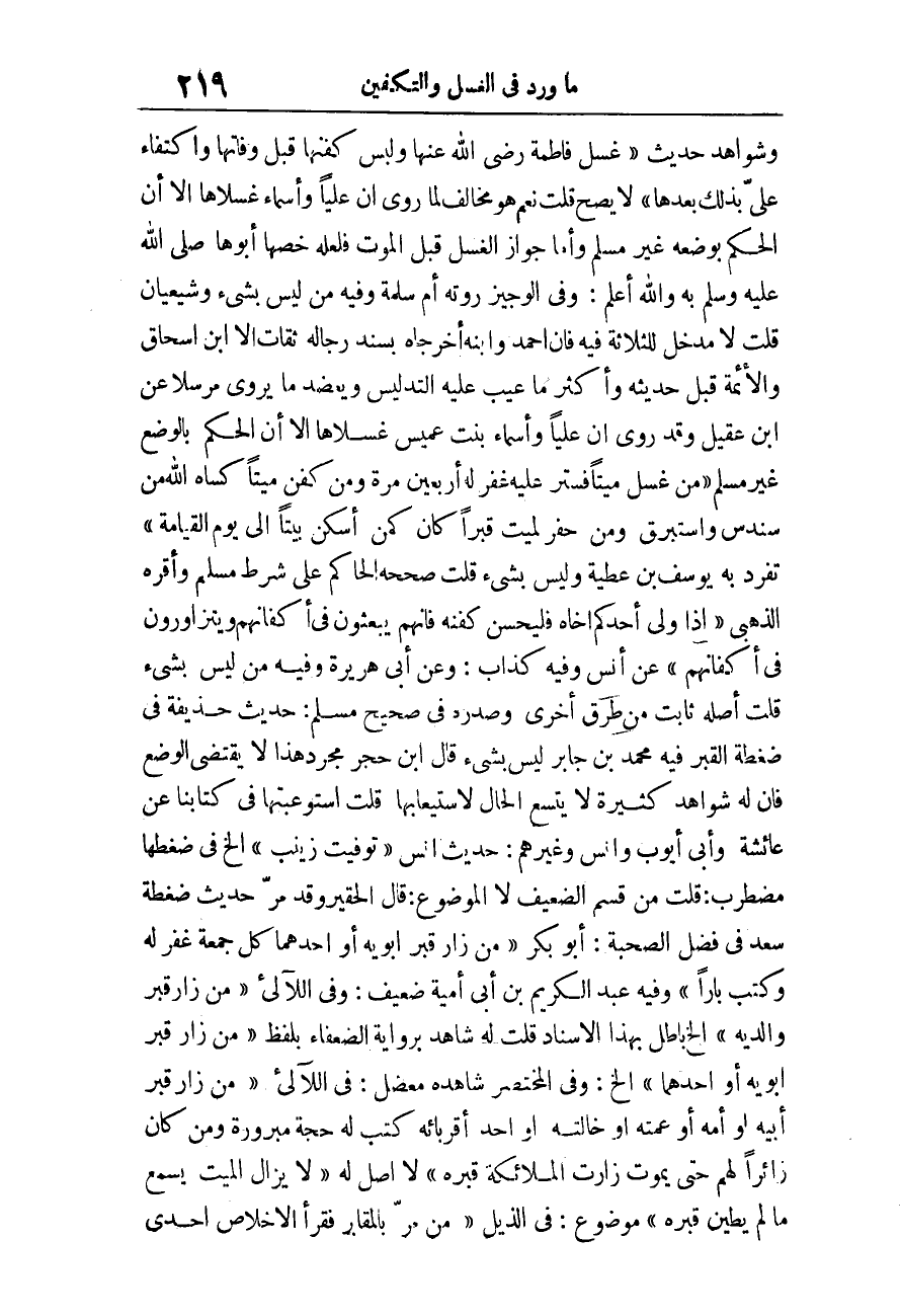 حَدِيث «غَسْلُ فَاطِمَةَ رَضِيَ اللَّهُ عَنْهَا وَلُبْسُ كَفَنِهَا قَبْلَ وَفَاتِهَا وَاكْتِفَاءِ عَلِيٍّ بِذَلِكَ بَعْدَهَا» لَا يَصِحُّ قلت نعم هُوَ مُخَالف لما رُوِيَ أَن عليا وَأَسْمَاء غسلاها إِلَّا أَن الحكم بِوَضْعِهِ غير مُسلم وَأما جَوَاز الْغسْل قبل الْمَوْت فَلَعَلَّهُ خصها أَبوهَا صلى الله عَلَيْهِ وَسلم بِهِ وَالله أعلم، وَفِي الْوَجِيز روته أم سَلمَة وَفِيه من لَيْسَ بِشَيْء وشيعيان قلت لَا مدْخل للثَّلَاثَة فِيهِ فَإِن أَحْمد وَابْنه أَخْرجَاهُ بِسَنَد رِجَاله ثِقَات إِلَّا ابْن إِسْحَاق وَالْأَئِمَّة قبل حَدِيثه وَأكْثر مَا عيب عَلَيْهِ التَّدْلِيس ويعضد مَا يرْوى مُرْسلا عَن ابْن عقيل وَقد رُوِيَ أَن عليا وَأَسْمَاء بنت عُمَيْس غسلاها إِلَّا أَن الحكم بِالْوَضْعِ غير مُسلم.