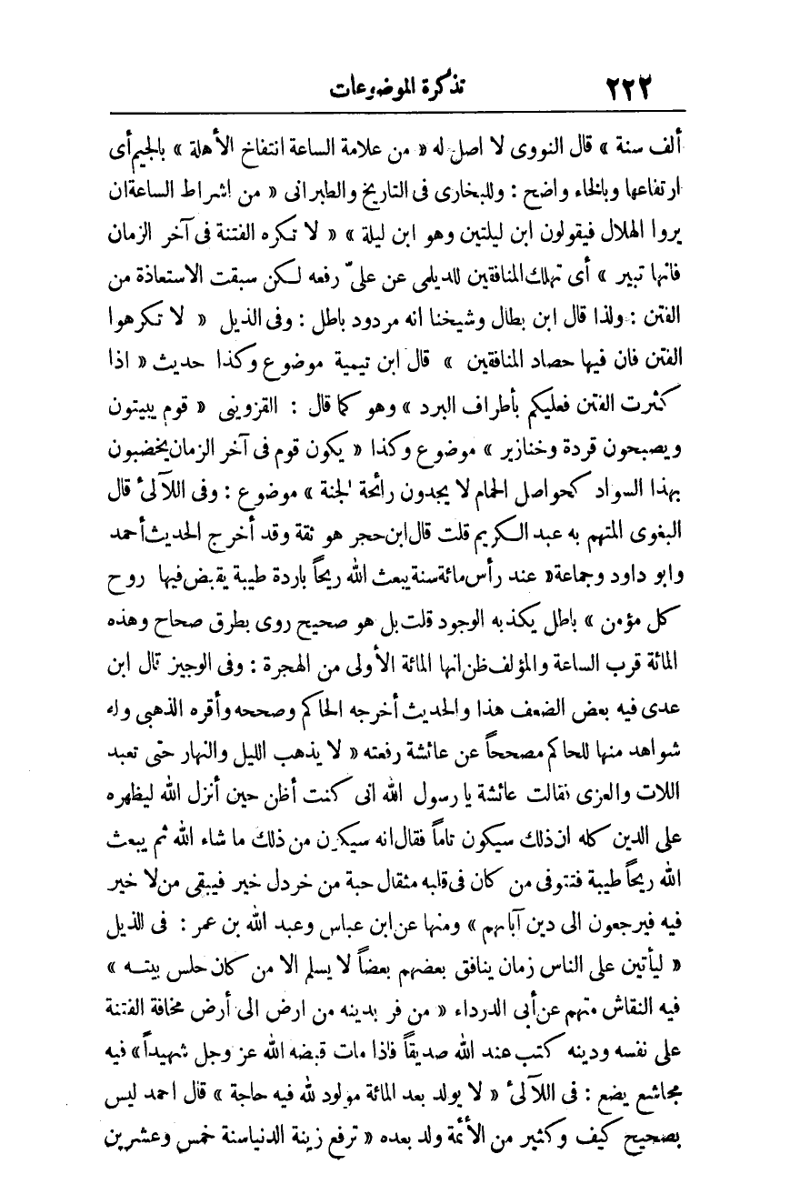 «عِنْدَ رَأْسِ مِائَةِ سَنَةٍ يَبْعَثُ اللَّهُ رِيحًا بَارِدَةً طَيِّبَةً يَقْبِضُ فِيهَا رُوحَ كُلِّ مُؤْمِنٍ» بَاطِلٌ يُكَذِّبُهُ الْوُجُودُ قُلْتُ بَلْ هُوَ صَحِيح رُوِيَ بطرق صِحَاح وَهَذِه الْمِائَة قرب السَّاعَة والمؤلف ظن أَنَّهَا الْمِائَة الأولى من الْهِجْرَة، وَفِي الْوَجِيز قَالَ ابْن عدي فِيهِ بعض الضعْف هَذَا والْحَدِيث أخرجه الْحَاكِم وَصَححهُ وَأقرهُ الذَّهَبِيّ وَله شَوَاهِد مِنْهَا للْحَاكِم مصححا عَن عَائِشَة رفعته «لَا يذهب اللَّيْل وَالنَّهَار حَتَّى تعبد اللات والعزى فَقَالَت عَائِشَة يَا رَسُول الله أَنِّي كنت أَظن حِين أنزل الله لِيظْهرهُ على الدَّين كُله أَن ذَلِك سَيكون تَاما فَقَالَ إِنَّه سَيكون من ذَلِك مَا شَاءَ الله ثمَّ يبْعَث الله ريحًا طيبَة فتتوفى من كَانَ فِي قلبه مِثْقَال حَبَّة من خَرْدَل خير فَيبقى من لَا خير فِيهِ فيرجعون إِلَى دين آبَائِهِم» وَمِنْهَا عَن ابْن عَبَّاس وَعبد الله بن عمر.