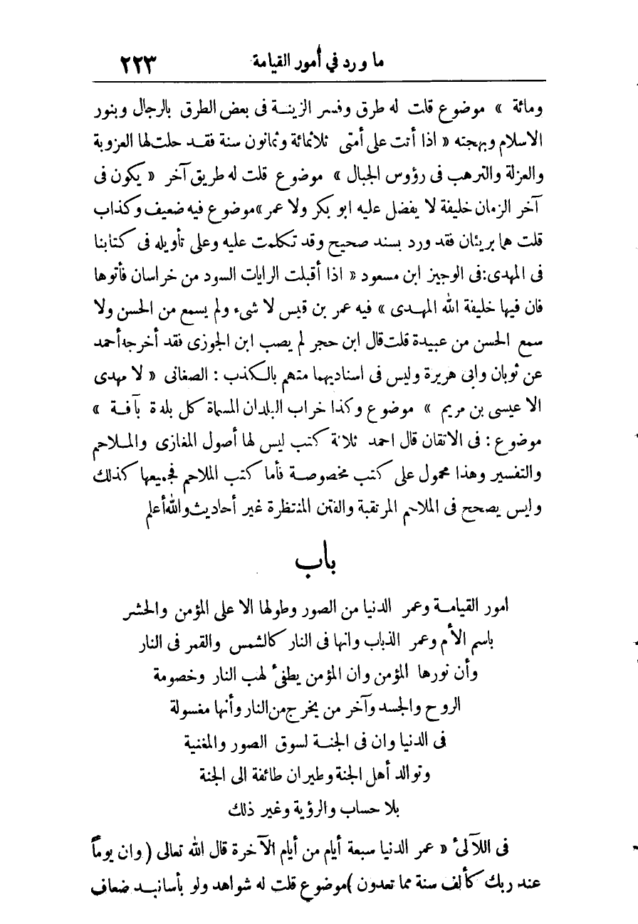 بَاب أُمُور الْقِيَامَة وَعمر الدُّنْيَا من الصُّور وطولها على الْمُؤمن والحشر باسم الْأُم وَعمر الذُّبَاب وَأَنَّهَا فِي النَّار كَالشَّمْسِ وَالْقَمَر فِي النَّار وَأَن نورها الْمُؤمن وَأَن الْمُؤمن يُطْفِئ لَهب النَّار وخصومة الرّوح والجسد وَآخر من يخرج من النَّار وَأَنَّهَا مغسولة فِي الدُّنْيَا وَأَن فِي الْجنَّة لسوق الصُّور والمغنية وتوالد أهل الْجنَّة وطيران طَائِفَة إِلَى الْجنَّة بِلَا حِسَاب والرؤية وَغير ذَلِك.