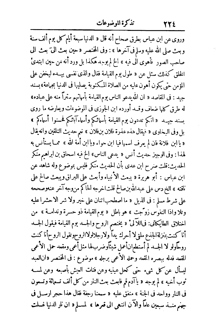 فِي اللآلئ «يَخْتَصِمُ الرُّوحُ وَالْجَسَدُ يَوْمَ الْقِيَامَةِ فَيَقُولُ الْجَسَدُ أَنَا كُنْتُ بِمَنْزِلَةِ الْجِذْعِ مُلْقًى لَا أُحَرِّكُ يَدًا وَلا رِجْلا لَوْلا الرُّوحُ وَتَقُولُ الرُّوحُ أَنَا كُنْتُ رُوحًا وَلَوْلا الْجَسَدُ لَمْ أَسْتَطِعْ أَنْ أَعْمَلَ شَيْئًا وَضَرَبَ لَهَا مَثَلَ أَعْمَى وَمُقْعَدٍ حَمَلَ الأَعْمَى الْمُقْعَدَ فَدَلَّهُ بِبَصَرِهِ الْمُقْعَدُ وَحَمَلَهُ الأَعْمَى بِرِجْلِهِ» مَوْضُوع.