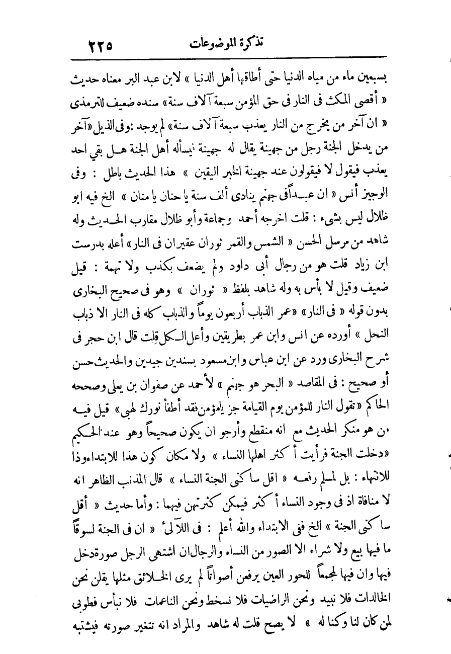 فِي اللآلئ «إِنَّ فِي الْجَنَّةِ لَسُوقًا مَا فِيهَا بَيْعٌ وَلا شِرَاءٌ إِلا الصُّوَرُ مِنَ النِّسَاءِ وَالرِّجَالِ إِنِ اشْتَهَى الرَّجُلُ صُورَةً دَخَلَ فِيهَا وَإِنَّ فِيهَا لَمَجْمَعًا لِلْحُورِ الْعِينِ يَرْفَعْنَ أَصْوَاتًا لَمْ يَرَى الْخَلائِقُ مِثْلَهَا يَقُلْنَ نَحْنُ الْخَالِدَاتُ فَلا نَبِيدُ وَنَحْنُ الرَّاضِيَاتُ فَلا نَسْخَطُ وَنَحْنُ النَّاعِمَاتُ فَلا نَبَأَسُ فَطُوبَى لِمَنْ كَانَ لَنَا وَكُنَّا لَهُ» لَا يَصح قلت لَهُ شَاهد وَالْمرَاد أَنه تَتَغَيَّر صورته فيشتبه -[226]- بِتِلْكَ الصُّورَة لَا أَنه يدْخل فِيهَا حَقِيقَة أَو أَن المُرَاد بالصورة الشكل والهيئة وأصل ذكر السُّوق من غير تعرض لذكر الصُّور فِي مُسلم، وَفِي الْوَجِيز فِيهِ عبد الرَّحْمَن بن إِسْحَاق مَتْرُوك قلت أخرجه التِّرْمِذِيّ وَغَيره، وَقَالَ ابْن حجر عبد الرَّحْمَن حسن لَهُ التِّرْمِذِيّ حَدِيثا غير هَذَا مَعَ قَوْله أَنه تكلم فِيهِ من قبل حفظه وَصَححهُ لَهُ الْحَاكِم حَدِيثا آخرا وَله شَاهد، وَعَن جَابِرٌ «لَيْسَ أَحَدٌ مِنْ أَهْلِ الْجَنَّةِ إِلا يُدْعَى بِاسْمِهِ إِلا آدَمُ فَإِنَّهُ يُكْنَى أَبَا مُحَمَّدٍ» إِلَخ. أوردهُ عَن عَليّ وَجَابِر وأعل الْكل: قلت وَله شَوَاهِد عَن كَعْب وغالب بن عبد الله.