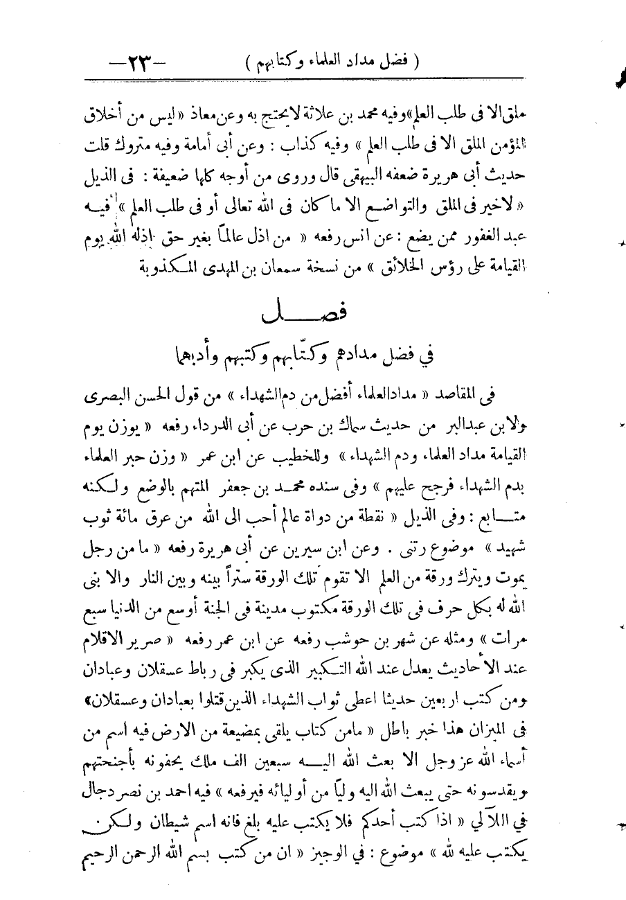 وَفِي الذيل «نُقْطَةٌ مِنْ دَوَاةِ عَالِمٍ أَحَبُّ إِلَى اللَّهِ مِنْ عَرَقِ مِائَةِ ثوب شَهِيد» مَوْضُوع رتني.