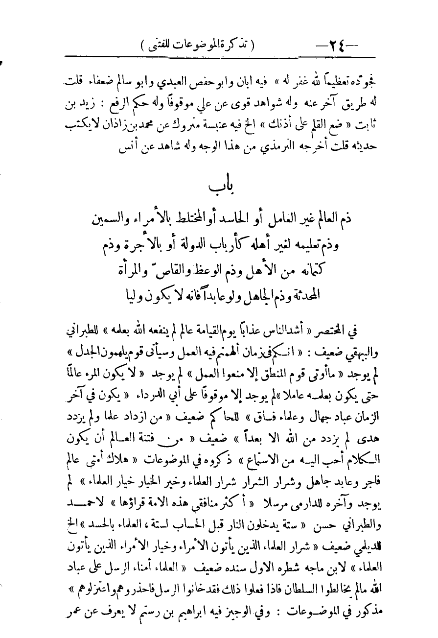 «الْعُلَمَاءُ أُمَنَاءُ الرُّسُلِ عَلَى عِبَادِ اللَّهِ مَا لَمْ يُخَالِطُوا السُّلْطَانَ فَإِذَا فَعَلُوا ذَلِكَ فَقَدْ خَانُوا الرُّسُل فاحذروهم واعتزلوهم» مَذْكُور فِي الموضوعات، وَفِي الْوَجِيز فِيهِ إِبْرَاهِيم بن رستم لَا يعرف عَن عمر -[25]- أبي الحفص الْعَبْدي مَتْرُوك قلت لَيْسَ بمتروك بل من رجال السّنَن وَثَّقَهُ أَحْمد وَغير وَضعه آخَرُونَ بِكَلَام هَين وَابْن رستم مَعْرُوف ابْن معِين هُوَ ثِقَة وَقيل فَقِيه عباد مَشْهُور امْتنع عَن الْقَضَاء: الدَّارَقُطْنِيّ مَشْهُور وَلَيْسَ بِقَوي، وَقد ورد الحَدِيث عَن عَليّ وموقوفا على جَعْفَر بن مُحَمَّد وَله شَوَاهِد، وَفِي الْمَقَاصِد «الْفُقَهَاء أُمَنَاء الرَّسُول مَا لم يدخلُوا فِي الدُّنْيَا ويتبعوا الشَّيْطَان فَإِذا فعلوا ذَلِك فاحذروهم» سَنَده ضَعِيف.