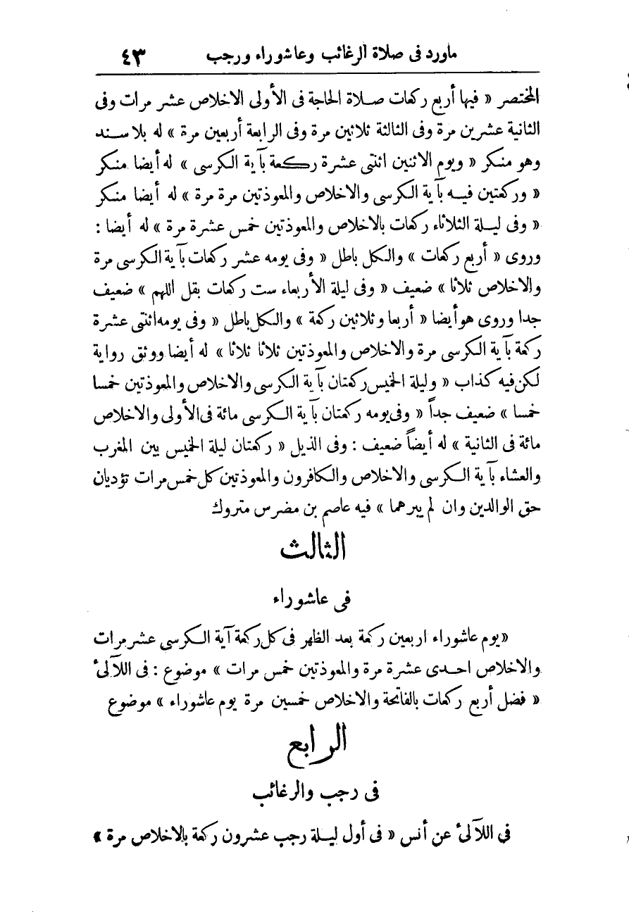 الْمُخْتَصر» فِيهَا أَربع رَكْعَات صَلَاة الْحَاجة فِي الأولى الْإِخْلَاص عشر مَرَّات وَفِي الثَّانِيَة عشْرين مرّة وَفِي الثَّالِثَة ثَلَاثِينَ مرّة وَفِي الرَّابِعَة أَرْبَعِينَ مرّة «لَهُ بِلَا سَنَد وَهُوَ مُنكر» يَوْم الِاثْنَيْنِ اثْنَتَيْ عشرَة رَكْعَة بِآيَة الْكُرْسِيّ «لَهُ أَيْضا مُنكر» وَرَكْعَتَيْنِ فِيهِ بِآيَة الْكُرْسِيّ وَالْإِخْلَاص والمعوذتين مرّة مرّة «لَهُ أَيْضا مُنكر» وَفِي لَيْلَة الثُّلَاثَاء رَكْعَات بالإخلاص والمعوذتين خمس عشرَة مرّة «لَهُ أَيْضا، وَرُوِيَ» أَربع رَكْعَات «وَالْكل بَاطِل» وَفِي يَوْمه عشر رَكْعَات بِآيَة الْكُرْسِيّ مرّة وَالْإِخْلَاص ثَلَاثًا «ضَعِيف» وَفِي لَيْلَة الْأَرْبَعَاء سِتّ رَكْعَات بقل اللَّهُمَّ «ضَعِيف جدا وروى هُوَ أَيْضا» أَرْبعا وَثَلَاثِينَ رَكْعَة «وَالْكل بَاطِل» وَفِي يَوْمه اثْنَتَيْ عشر رَكْعَة بِآيَة الْكُرْسِيّ مرّة وَالْإِخْلَاص مرّة والمعوذتين ثَلَاثًا ثَلَاثًا «لَهُ أَيْضا ووثق رِوَايَة لَكِن فِيهِ كَذَّاب» وَلَيْلَة الْخَمِيس رَكْعَتَانِ بِآيَة الْكُرْسِيّ وَالْإِخْلَاص والمعوذتين خمْسا خمْسا «ضَعِيف جدا» وَفِي يَوْمه رَكْعَتَانِ بِآيَة الْكُرْسِيّ مائَة فِي الأولى وَالْإِخْلَاص مائَة فِي الثَّانِيَة «لَهُ أَيْضا ضَعِيف، وَفِي الذيل» رَكْعَتَانِ لَيْلَة الْخَمِيس بَين الْمغرب وَالْعشَاء بِآيَة الْكُرْسِيّ وَالْإِخْلَاص والكافرون والمعوذتين كل خمس مَرَّات تؤديان حق الْوَالِدين وَإِن لم يَبرهُمَا" فِيهِ عَاصِم بن مُضرس مَتْرُوك.