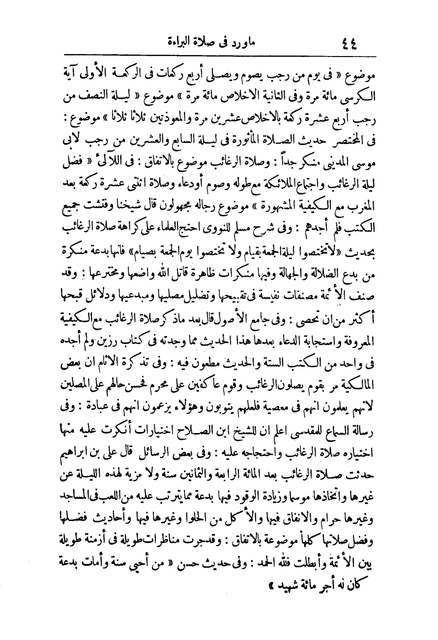 وَصَلَاة الرغائب مَوْضُوع بالِاتِّفَاقِ، فِي اللآلئ «فَضْلُ لَيْلَةِ الرَّغَائِبِ وَاجْتِمَاعِ الْمَلائِكَةِ مَعَ طُولِهِ وَصَوْمٍ أَوْ دُعَاءٍ وَصَلاةِ اثْنَتَيْ عَشْرَةَ رَكْعَةً بَعْدَ الْمَغْرِبِ مَعَ الْكَيْفِيَّةِ الْمَشْهُورَةِ» مَوْضُوعٌ رِجَاله مَجْهُولُونَ قَالَ شَيخنَا وفتشت جَمِيع الْكتب فَلم أجدهم، وَفِي شرح مُسلم للنووي احْتج الْعلمَاء على كَرَاهَة صَلَاة الرغائب بِحَدِيث «لَا تختصوا لَيْلَة الْجُمُعَة بِقِيَام وَلَا تختصوا يَوْم الْجُمُعَة بصيام» فَإِنَّهَا بِدعَة مُنكرَة من بدع الضَّلَالَة والجهالة وفيهَا مُنكرَات ظَاهِرَة قَاتل الله واضعها ومخترعها، وَقد صنف الْأَئِمَّة مصنفات نفيسة فِي تقبيحها وتضليل مصليها ومبدعيها وَدَلَائِل قبحها أَكثر من أَن تحصى، وَفِي جَامع الْأُصُول قَالَ بعد مَا ذكر صَلَاة الرغائب مَعَ الْكَيْفِيَّة الْمَعْرُوفَة واستجابة الدُّعَاء بعْدهَا هَذَا الحَدِيث مِمَّا وجدته فِي كتاب رزين وَلم أَجِدهُ فِي وَاحِد من الْكتب السِّتَّة والْحَدِيث مطعون فِيهِ، وَفِي تذكرة الآثام أَن بعض الْمَالِكِيَّة مر بِقوم يصلونَ الرغائب وَقوم عاكفين على محرم فَحسن حَالهم على الْمُصَلِّين لأَنهم يعلمُونَ أَنهم فِي مَعْصِيّة فلعلهم يتوبون وَهَؤُلَاء يَزْعمُونَ أَنهم فِي عبَادَة، وَفِي رِسَالَة السماع للمقدسي اعْلَم أَن للشَّيْخ ابْن الصّلاح اختيارات أنْكرت عَلَيْهِ مِنْهَا اخْتِيَاره صَلَاة الرغائب واحتجاجه عَلَيْهِ، وَفِي بعض الرسائل قَالَ عَليّ بن إِبْرَاهِيم حدثت صَلَاة الرغائب بعد الْمِائَة الرَّابِعَة والثمانين سنة وَلَا مزية لهَذِهِ اللَّيْلَة عَن غَيرهَا واتخاذها موسما وَزِيَادَة الْوقُود فِيهَا بِدعَة مِمَّا يَتَرَتَّب عَلَيْهِ من اللّعب فِي الْمَسَاجِد وَغَيرهَا حرَام والانفاق فِيهَا وَالْأكل من الْحَلْوَى [أَو: الْحَلْوَاء] وَغَيرهَا فِيهَا وَأَحَادِيث فَضلهَا وَفضل صلَاتهَا كلهَا مَوْضُوعَة بالِاتِّفَاقِ، وَقد جرت مناظرات طَوِيلَة فِي أزمنة طَوِيلَة بَين الْأَئِمَّة وأبطلت فَللَّه الْحَمد، وَفِي حَدِيث حسن «من أحيى سنة وأمات بِدعَة كَانَ لَهُ أجر مائَة شَهِيد» .