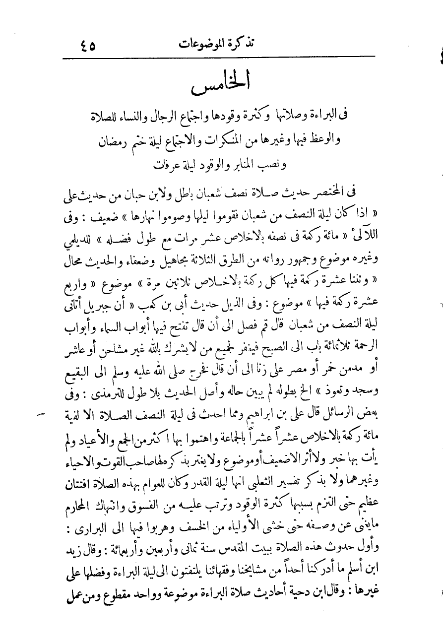 فِي الْمُخْتَصر حَدِيث صَلَاة نصف شعْبَان بَاطِل وَلابْن حبَان من حَدِيث عَليّ «إِذَا كَانَ لَيْلَةُ النِّصْفِ مِنْ شَعْبَانَ فَقُومُوا لَيْلَهَا وَصُومُوا نَهَارَهَا» ضَعِيف، وَفِي اللآلئ «مائَة رَكْعَة فِي نصفه بالإخلاص عشر مَرَّات مَعَ طول فَضله» للديلمي وَغَيره مَوْضُوع وَجُمْهُور رُوَاته من الطّرق الثَّلَاثَة مَجَاهِيل وضعفاء والْحَدِيث محَال «وثنتا عشر رَكْعَة فِيهَا كل رَكْعَة بالإخلاص ثَلَاثِينَ مرّة» مَوْضُوع «وَأَرْبع عشرَة رَكْعَة فِيهَا» مَوْضُوع، وَفِي الذيل حَدِيث أبي بن كَعْب «أَن جِبْرِيل أَتَانِي لَيْلَة النّصْف من شعْبَان قَالَ قُم فصل إِلَى أَن قَالَ تفتح فِيهَا أَبْوَاب السَّمَاء وأبواب الرَّحْمَة ثَلَاثمِائَة بَاب إِلَى الصُّبْح فَيغْفر لجَمِيع من لَا يُشْرك بِاللَّه غير مُشَاحِن أَو عَاشر أَو مدمن خمر أَو مصر على زنا إِلَى أَن قَالَ فَخرج صَلَّى اللَّهُ عَلَيْهِ وَسَلَّمَ إِلَى البقيع وَسجد وتعوذ» إِلَخ. بِطُولِهِ لم يبين حَاله وأصل الحَدِيث بِلَا طول لِلتِّرْمِذِي، وَفِي بعض الرسائل قَالَ عَليّ بن إِبْرَاهِيم وَمِمَّا أحدث فِي لَيْلَة النّصْف الصَّلَاة الألفية مائَة رَكْعَة بالإخلاص عشرا عشرا بِالْجَمَاعَة واهتموا بهَا أَكثر من الْجمع والأعياد وَلم يَأْتِ بهَا خبر وَلَا أثر إِلَّا ضَعِيف أَو مَوْضُوع وَلَا يغتر بِذكرِهِ لَهَا صَاحب الْقُوت والإحياء وَغَيرهمَا وَلَا بِذكر تَفْسِير الثَّعْلَبِيّ أَنَّهَا لَيْلَة الْقدر وَكَانَ للعوام بِهَذِهِ الصَّلَاة افتتان عَظِيم حَتَّى الْتزم بِسَبَبِهَا كَثْرَة الْوقُود وترتب عَلَيْهِ من الفسوق وانتهاك الْمَحَارِم مَا يُغني عَن وَصفه حَتَّى خشِي الْأَوْلِيَاء من الْخَسْف وهربوا فِيهَا إِلَى البراري، وَأول حُدُوث هَذِه الصَّلَاة بِبَيْت الْمُقَدّس سنة ثَمَانِي وَأَرْبَعين وَأَرْبَعمِائَة، وَقَالَ زيد بن أسلم مَا أدركنا أحدا من مَشَايِخنَا وفقهائنا يلتفتون إِلَى لَيْلَة الْبَرَاءَة وفضلها على غَيرهَا، وَقَالَ ابْن دحْيَة أَحَادِيث صَلَاة الْبَرَاءَة مَوْضُوعَة وَوَاحِد مَقْطُوع وَمن عمل