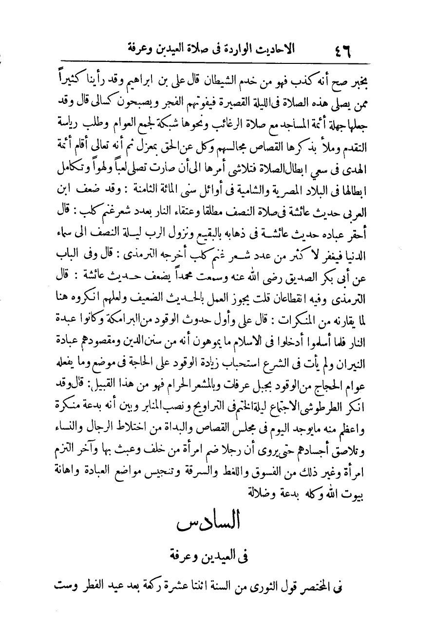 فِي الْمُخْتَصر قَول الثَّوْريّ من السّنة اثْنَتَا عشرَة رَكْعَة بعد عيد الْفطر وست -[47]- رَكْعَات بعد الْأَضْحَى لَا أصل لَهُ، وَفِي الصَّحِيح خِلَافه وَهُوَ أَنَّهُ صَلَّى اللَّهُ عَلَيْهِ وَسَلَّمَ لم يصل قبلهَا وَلَا بعْدهَا وَقَول التَّابِعِيّ من السّنة كَذَا مَوْقُوف على الصَّحِيح أما قَول تَابع التَّابِعِيّ فمنقطع «من أحيى لَيْلَتي الْعِيد لم يَمُتْ قَلْبُهُ يَوْمَ تَمُوتُ الْقُلُوبُ» لِابْنِ مَاجَه ضَعِيف.