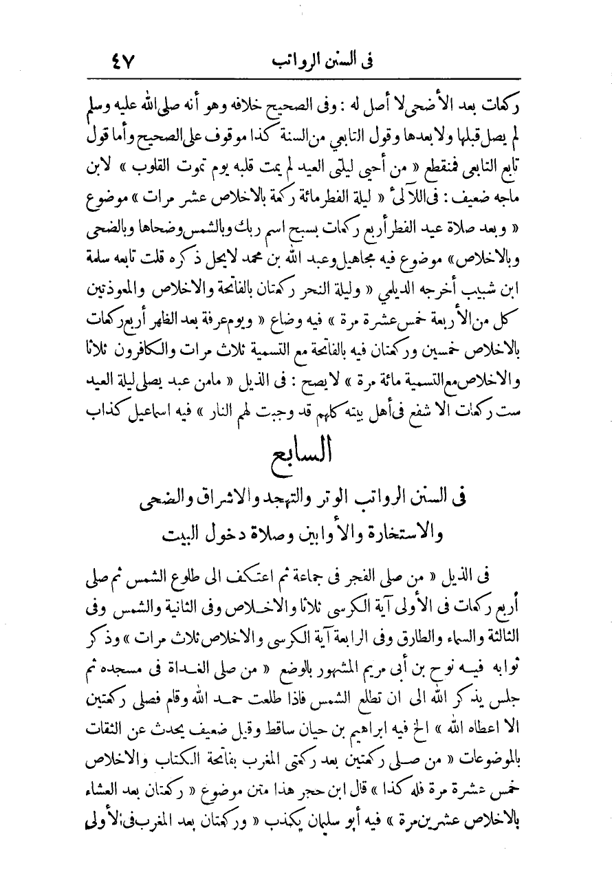 [الْفَصْلُ] السَّابِعُ فِي السُّنَنِ الرَّوَاتِبِ الْوتر والتهجد وَالْإِشْرَاق وَالضُّحَى والاستخارة والأوابين وَصَلَاة دُخُول الْبَيْت.