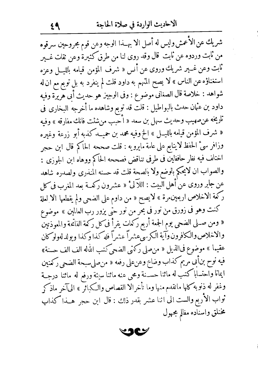 وَعَن عَليّ رَفعه «مَنْ صَلَّى سُبْحَةَ الضُّحَى رَكْعَتَيْنِ إِيمَانًا وَاحْتِسَابًا كُتِبَ لَهُ مِائَتَا حَسَنَةٍ وَمُحِيَ عَنْهُ مِائَتَا سَيِّئَةٍ وَرُفِعَ لَهُ مِائَتَا دَرَجَةٍ وَغُفِرَ لَهُ ذنُوبه وَكلهَا مَا تقدم مِنْهَا وَمَا تَأَخَّرَ إِلا الْقِصَاصَ والكبائر» إِلَى آخر مَا ذكر ثَوَاب الْأَرْبَع والست إِلَى اثْنَا عشر بِقدر ذَلِك: قَالَ ابْن حجر هَذَا كَذَّاب مختلق وَإِسْنَاده مظلم مَجْهُول.
