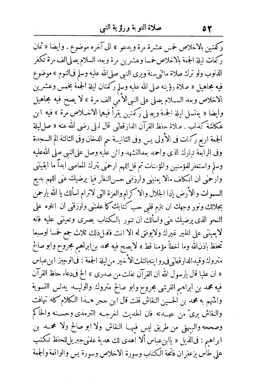 «صَلاةُ رُؤْيَتِهِ صَلَّى اللَّهُ عَلَيْهِ وَسَلَّمَ رَكْعَتَانِ لَيْلَةَ الْجُمُعَةِ بِخَمْسٍ وَعِشْرِينَ الإِخْلاصَ وَبَعْدَ السَّلامِ يُصَلِّي عَلَى النَّبِيِّ الأُمِّيِّ أَلْفَ مَرَّةٍ» لَا يَصح فِيهِ مَجَاهِيل وَأَيْضًا «يَغْتَسِلُ لَيْلَةَ الْجُمُعَةِ وَيُصَلِّي رَكْعَتَيْنِ يقْرَأ فيهمَا الْإِخْلَاص مرّة» فِيهِ ابْن عكاشة كَذَّاب.