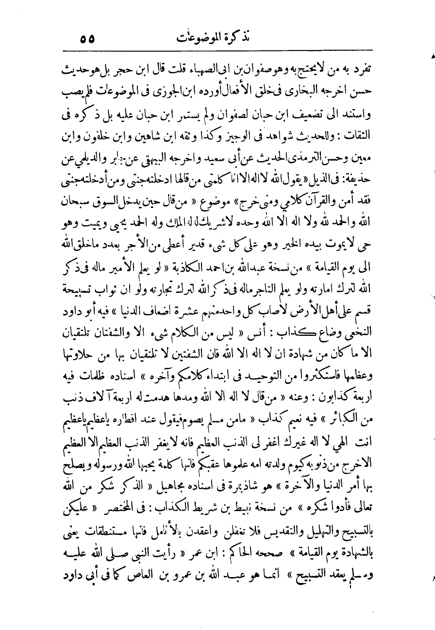 «مَنْ قَالَ حِينَ يَدْخُلُ السُّوقَ سُبْحَانَ اللَّهِ وَالْحَمْدُ لِلَّهِ وَلا إِلَهَ إِلا اللَّهُ وَحْدَهُ لَا شَرِيكَ لَهُ لَهُ الْمُلْكُ وَلَهُ الْحَمد يحي وَيُمِيت وَهُوَ حَيّ لَا يَمُوتُ بِيَدِهِ الْخَيْرُ وَهُوَ عَلَى كُلِّ شَيْءٍ قَدِيرٌ أُعْطِيَ مِنَ الأَجْرِ بِعَدَدِ مَا خَلَقَ الله إِلَى يَوْم الْقِيَامَة» من نُسْخَة عبد الله بن أَحْمد الكاذبة.