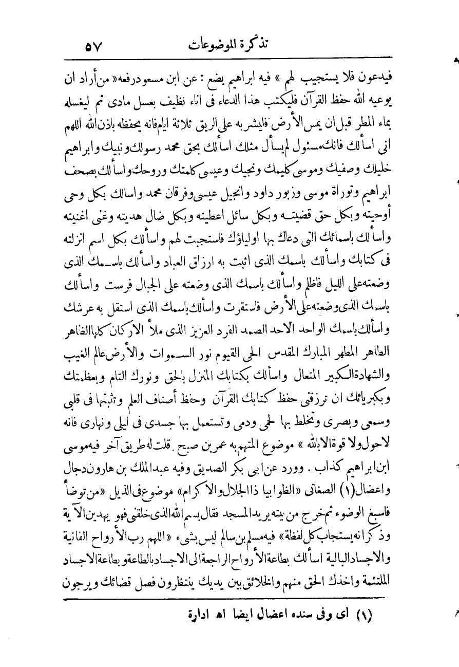 عَن ابْن مَسْعُود رَفعه «مَنْ أَرَادَ أَنْ يُوَعِّيَهُ اللَّهُ حِفْظَ الْقُرْآنِ فَلْيَكْتُبْ هَذَا الدُّعَاءَ فِي إِنَاءٍ نَظِيفٍ بِعَسَلٍ مَادِيٍّ ثُمَّ لِيَغْسِلْهُ بِمَاءِ الْمَطَرِ قَبْلَ أَنْ يَمَسَّ الأَرْضَ فَلْيَشْرَبْهُ عَلَى الرِّيقِ ثَلاثَةَ أَيَّامٍ فَإِنَّهُ يَحْفَظُهُ بِإِذْنِ اللَّهِ اللَّهُمَّ إِنِّي أَسْأَلُكَ فَإِنَّكَ مَسْئُولٌ لَمْ يُسْأَلْ مِثْلُكَ أَسْأَلُكَ بِحَقِّ مُحَمَّدٍ رَسُولِكَ وَنَبِيِّكَ وَإِبْرَاهِيمَ خَلِيلِكَ وَصَفِيِّكَ وَمُوسَى كَلِيمِكَ وَنَجِيِّكَ وَعِيسَى كَلِمَتِكَ وَرُوحِكَ وَأَسْأَلُكَ بِصُحُفِ إِبْرَاهِيمَ وَتَوْرَاةِ مُوسَى وَزَبُورِ دَاوُدَ وَإِنْجِيلِ عِيسَى وَفُرْقَانِ مُحَمَّدٍ وَأَسْأَلُكَ بِكُلِّ وَحْيٍ أَوْحَيْتَهُ وَبِكُلِّ حَقٍّ قَضَيْتَهُ وَبِكُلِّ سَائِلٍ أَعْطَيْتَهُ وَبِكُلِّ ضَالٍّ هَدَيْتَهُ وَغَنِيٍّ أَغْنَيْتَهُ وَأَسْأَلُكَ بِأَسْمَائِكَ الَّتِي دَعَاكَ بِهَا أَوْلِيَاؤُكَ فَاسْتَجَبْتَ لَهُمْ وَأَسْأَلُكَ بِكُلِّ اسْمٍ أَنْزَلْتَهُ فِي كِتَابِكَ وَأَسْأَلُكَ بِاسْمِكَ الَّذِي أَثْبَتَّ بِهِ أَرْزَاقَ الْعِبَادِ وَأَسْأَلُكَ بِاسْمِكَ الَّذِي وَضَعْتَهُ عَلَى اللَّيْلِ فَأَظْلَمَ وَأَسْأَلُكَ بِاسْمِكَ الَّذِي وَضَعْتَهُ عَلَى الْجِبَالِ فَرَسَتْ وَأَسْأَلُكَ بِاسْمِكَ الَّذِي وَضَعْتَهُ عَلَى الأَرْضِ فَاسْتَقَرَّتْ وَأَسْأَلُكَ بِاسْمِكَ الَّذِي اسْتَقَلَّ بِهِ عَرْشُكَ وَأَسْأَلُكَ بِاسْمِكَ الْوَاحِدِ الأَحَدِ الصَّمَدِ الْفَرْدِ الْعَزِيزِ الَّذِي مَلأَ الأَرْكَانَ كُلَّهَا الظَّاهِرِ الطَّاهِرِ الْمُطَهَّرِ الْمُبَارَكِ الْمُقَدَّسِ الْحَيِّ الْقَيُّومِ نُورِ السَّمَوَاتِ وَالأَرْضِ عَالِمِ الْغَيْبِ وَالشَّهَادَةِ الْكَبِيرِ الْمُتَعَالِ وَأَسْأَلُكَ بِكِتَابِكَ الْمُنَزَّلِ بِالْحَقِّ وَنُورِكَ التَّامِّ وَبِعَظَمَتِكَ وَبِكِبْرِيَائِكَ أَنْ تَرْزُقَنِي حِفْظَ كِتَابِكَ الْقُرْآنِ وَحِفْظَ أَصْنَافِ الْعِلْمِ وَثَبِّتْهَا فِي قَلْبِي وَسَمْعِي وَبَصَرِي وَتَخْلِطُ بِهَا لَحْمِي وَدَمِي وَتَسْتَعْمِلُ بِهَا جَسَدِي فِي لِيَلِي وَنَهَارِي فَإِنَّهُ لَا حَوْلَ وَلا قُوَّةَ إِلَّا بِاللَّه» مَوْضُوع الْمُتَّهم بِهِ عمر بن صبح قلت لَهُ طَرِيق آخر فِيهِ مُوسَى ابْن إِبْرَاهِيم كَذَّاب. وَورد عَن أبي بكر الصّديق وَفِيه عبد الْملك بن هَارُون دجال وإعضال (¬1)