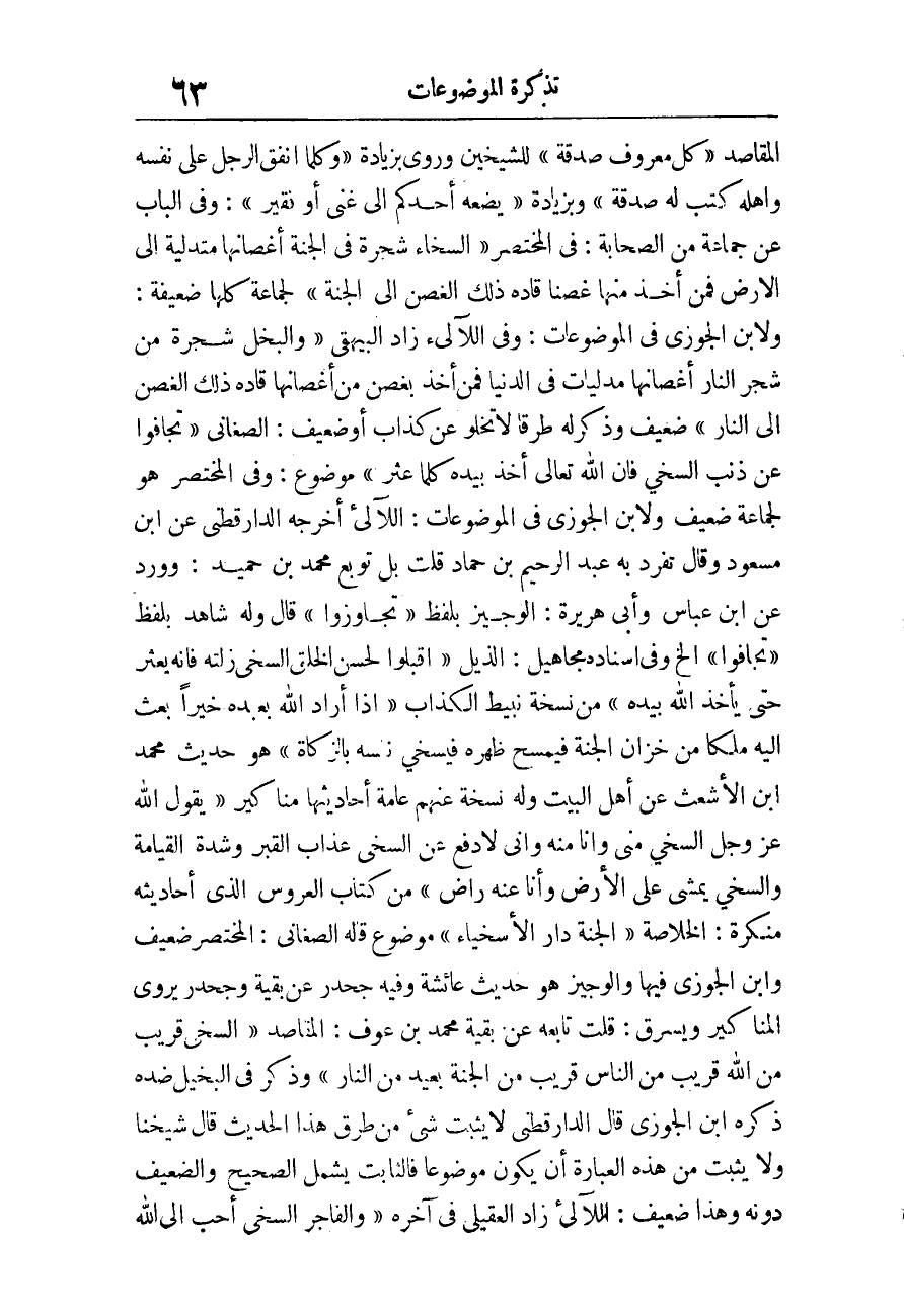 الصغاني «تَجَافُوا عَنْ ذَنْبِ السَّخِيِّ فَإِنَّ اللَّهَ تَعَالَى أَخَذَ بِيَدِهِ كُلَّمَا عثر» مَوْضُوع، وَفِي الْمُخْتَصر هُوَ لجَماعَة ضَعِيف وَلابْن الْجَوْزِيّ فِي الموضوعات: اللآلئ أخرجه الدَّارَقُطْنِيّ عَن ابْن مَسْعُود وَقَالَ تفرد بِهِ عبد الرَّحِيم بن حَمَّاد قلت بل توبع مُحَمَّد بن حميد، وَورد عَن ابْن عَبَّاس وَأبي هُرَيْرَة، وَالْوَجِيز بِلَفْظ «تجاوزا» قَالَ وَله شَاهد بِلَفْظ «تجافوا» إِلَخ. وَفِي إِسْنَاده مَجَاهِيل.