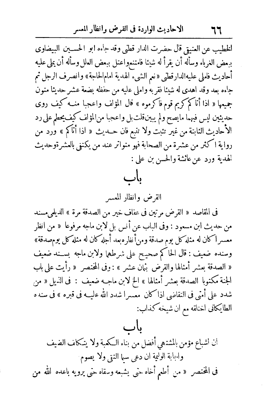 وَفِي الْبَاب عَن أنس بل لِابْنِ مَاجَه مَرْفُوعا «مَنْ أَنْظَرَ مُعْسِرًا كَانَ لَهُ مِثْلُهُ كُلَّ يَوْمٍ صَدَقَةٌ وَمَنْ أَنْظَرَهُ بَعْدَ أَجَلِهِ كَانَ لَهُ مِثْلُهُ كُلَّ يَوْمٍ صَدَقَةٌ» وَسَنَدُهُ ضَعِيف: قَالَ الْحَاكِم صَحِيح على شَرطهمَا وَلابْن مَاجَه بِسَنَد ضَعِيف «الصَّدَقَةُ بِعَشْرِ أَمْثَالِهَا وَالْقَرْضُ بِثَمَانِ عشر» ، وَفِي الْمُخْتَصر «رَأَيْتُ عَلَى بَابِ الْجَنَّةِ مَكْتُوبًا الصَّدَقَة بِعشر أَمْثَالهَا» إِلَخ. لَا بن مَاجَه ضَعِيف.
