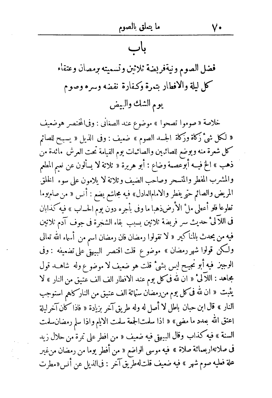 وَفِي الذيل «يُسَبِّحُ لِلصَّائِمِ كُلُّ شَعْرَةٍ مِنْهُ وَيُوضَعُ لِلصَّائِمِينَ وَالصَّائِمَاتِ يَوْمَ الْقِيَامَةِ تَحْتَ الْعَرْشِ مَائِدَةٌ مِنْ ذَهَبٍ» إِلَخ. فِيهِ أَبُو عصمَة وَضاع.