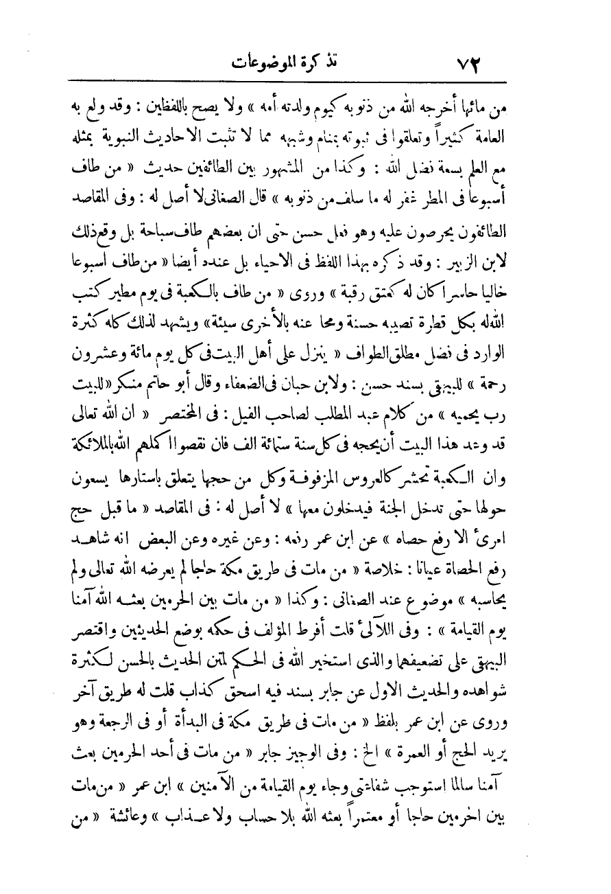 خُلَاصَة «مَنْ مَاتَ فِي طَرِيقِ مَكَّةَ حَاجًّا لَمْ يَعْرِضْهُ اللَّهُ تَعَالَى وَلم يحاسبه» مَوْضُوع عِنْد الصغاني، وَكَذَا «مَنْ مَاتَ بَيْنَ الْحَرَمَيْنِ بَعَثَهُ الله آمنا يَوْم الْقِيَامَة» ، وَفِي اللآلئ قلت أفرط الْمُؤلف فِي حكمه بِوَضْع الْحَدِيثين وَاقْتصر الْبَيْهَقِيّ على تضعيفهما وَالَّذِي أستخير الله فِي الحكم لمتن الحَدِيث بالْحسنِ لِكَثْرَة شواهده والْحَدِيث الأول عَن جَابر بِسَنَد فِيهِ إِسْحَاق كَذَّاب قلت لَهُ طَرِيق آخر وَرُوِيَ عَن ابْن عمر بِلَفْظ «مَنْ مَاتَ فِي طَرِيقِ مَكَّةَ فِي الْبَدْأَةِ أَوْ فِي الرَّجْعَةِ وَهُوَ يُرِيدُ الْحَجَّ أَوِ الْعُمْرَةَ» إِلَخ.