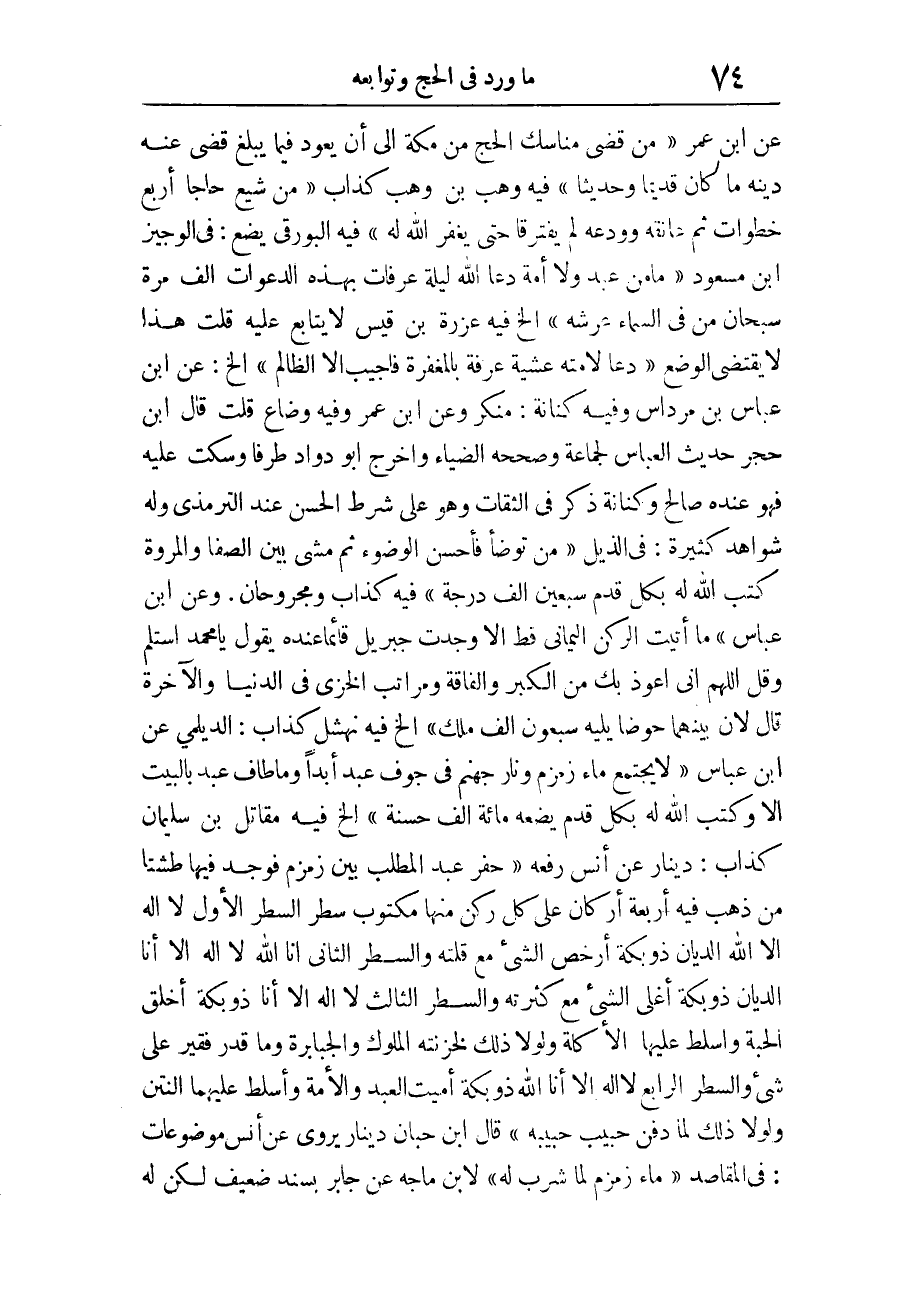 الديلمي عَن ابْن عَبَّاس «لَا يَجْتَمِعُ مَاءُ زَمْزَمَ وَنَارُ جَهَنَّمَ فِي جَوْفِ عَبْدٍ أَبَدًا وَمَا طَافَ عَبْدٌ بِالْبَيْتِ إِلا وَكَتَبَ اللَّهُ لَهُ بِكُلِّ قَدَمٍ يَضَعهُ مائَة ألف حَسَنَة» إِلَخ. فِيهِ مقَاتل بن سُلَيْمَان كَذَّاب.