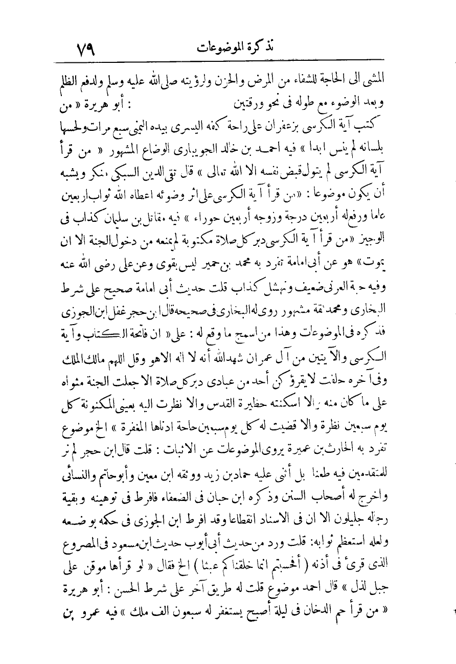 فِي الْوَجِيز «مَنْ قَرَأَ آيَةَ الْكُرْسِيِّ دُبُرَ كُلِّ صَلاةٍ مَكْتُوبَةٍ لَمْ يَمْنَعْهُ مِنْ دُخُولِ الْجَنَّةِ إِلا أَنْ يَمُوت» هُوَ عَن أبي أُمَامَة تفرد بِهِ مُحَمَّد بن حمير لَيْسَ بِقَوي وَعَن عَليّ رَضِي الله عَنهُ وَفِيه حَبَّة أتعرني ضَعِيف نهشل كَذَّاب قلت حَدِيث أبي أُمَامَة صَحِيح على شَرط البُخَارِيّ وَمُحَمّد ثِقَة مَشْهُور وروى لَهُ البُخَارِيّ فِي صَحِيحه قَالَ ابْن حجر غفل ابْن الْجَوْزِيّ فَذكره فِي الموضوعات وَهَذَا من السمج مَا وَقع لَهُ.