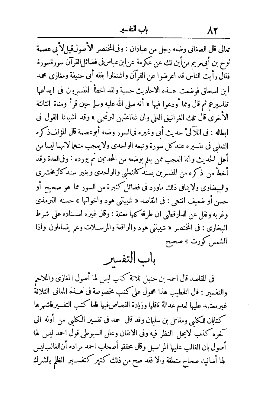 فِي الْمَقَاصِد قَالَ أَحْمد بن حَنْبَل ثَلَاثَة كتب لَيْسَ لَهَا أصُول الْمَغَازِي والملاحم وَالتَّفْسِير: قَالَ الْخَطِيب هَذَا مَحْمُول على كتب مَخْصُوصَة فِي هَذِه الْمعَانِي الثَّلَاثَة غير مُعْتَمد عَلَيْهَا لعدم عَدَالَة ناقلها وَزِيَادَة الْقصاص فِيهَا فَأَما كتب التَّفْسِير فأشهرها كِتَابَانِ للكلبي وَمُقَاتِل بن سُلَيْمَان وَقد قَالَ أَحْمد فِي تَفْسِير الْكَلْبِيّ من أَوله إِلَى آخِره كذب لَا يحل النّظر فِيهِ وَفِي الإتقان وَعلل السُّيُوطِيّ قَول أَحْمد لَيْسَ لَهَا أصُول بِأَن الْغَالِب عَلَيْهَا الْمَرَاسِيل وَقَالَ محققو أَصْحَاب أَحْمد مُرَاده أَن الْغَالِب لَيْسَ لَهَا أَسَانِيد صِحَاح مُتَعَلقَة وَإِلَّا فقد صَحَّ من ذَلِك كثير كتفسير الظُّلم بالشرك