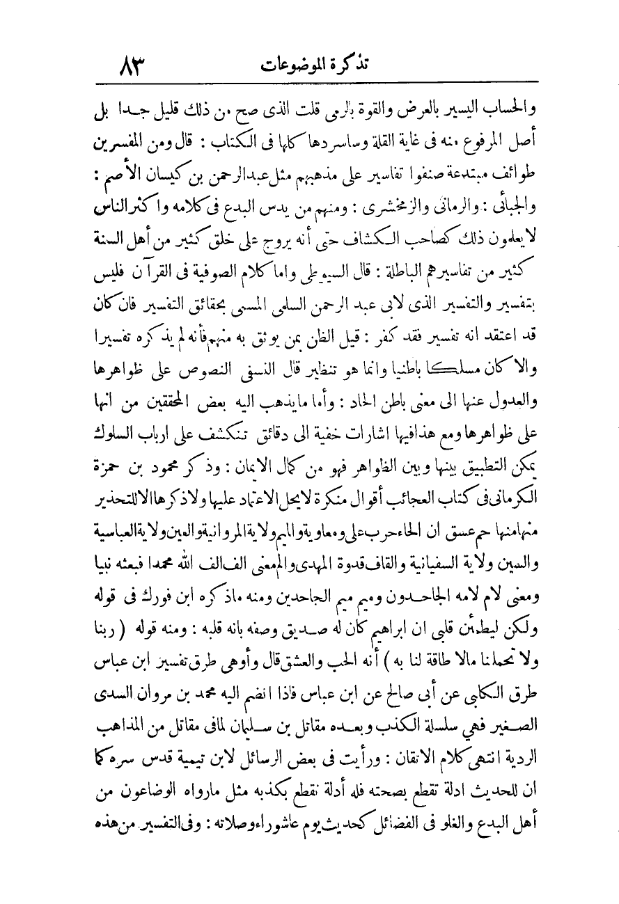 والحساب الْيَسِير بِالْعرضِ وَالْقُوَّة بِالرَّمْي قلت الَّذِي صَحَّ من ذَلِك قَلِيل جدا بل أصل الْمَرْفُوع مِنْهُ فِي غَايَة الْقلَّة وسأسردها كلهَا فِي الْكتاب، قَالَ وَمن الْمُفَسّرين طوائف مبتدعة صنفوا تفاسير على مَذْهَبهم مثل عبد الرَّحْمَن بن كيسَان الْأَصَم، والجبائي، والرماني والزمخشري، وَمِنْهُم من يدس الْبدع فِي كَلَامه وَأكْثر النَّاس لَا يعلمُونَ ذَلِك كصاحب الْكَشَّاف حَتَّى أَنه يروج على خلق كثير من أهل السّنة كثير من تفاسيرهم الْبَاطِلَة، قَالَ السُّيُوطِيّ وَأما كَلَام الصُّوفِيَّة فِي الْقُرْآن فَلَيْسَ بتفسير وَالتَّفْسِير الَّذِي لأبي عبد الرَّحْمَن السّلمِيّ الْمُسَمّى بحقائق التَّفْسِير فَإِن كَانَ قد اعْتقد أَنه تَفْسِير فقد كفر: قيل الظَّن بِمن يوثق بِهِ مِنْهُم فَأَنَّهُ لم يذكرهُ تَفْسِيرا وَإِلَّا كَانَ مسلكا باطنيا وَإِنَّمَا هُوَ تنظير قَالَ النَّسَفِيّ النُّصُوص على ظواهرها والعدول عَنْهَا إِلَى معنى بَاطِن الحاد، وَأما مَا يذهب إِلَيْهِ بعض الْمُحَقِّقين من أَنَّهَا على ظواهرها وَمَعَ هَذَا فِيهَا إشارات خُفْيَة إِلَى دقائق تنكشف على أَرْبَاب السلوك يُمكن التطبيق بَينهَا وَبَين الظَّوَاهِر فَهُوَ من كَمَال الْإِيمَان، وَذكر مَحْمُود بن حَمْزَة الْكرْمَانِي فِي كتاب الْعَجَائِب أَقْوَال مُنكرَة لَا يحل الِاعْتِمَاد عَلَيْهَا وَلَا ذكرهَا إِلَّا للتحذير مِنْهَا، مِنْهَا حم عسق إِن الْحَاء حَرْب عَليّ وَمُعَاوِيَة وَالْمِيم ولَايَة المروانية وَالْعين ولَايَة العباسية وَالسِّين ولَايَة السفيانية وَالْقَاف قدوة الْمهْدي وألم معنى ألف ألف الله مُحَمَّدًا فَبَعثه نَبيا وَمعنى لَام لامه الجاحدون وَمِيم مِيم الجاحدين وَمِنْه مَا ذكره ابْن فورك فِي قَوْله وَلَكِن لِيَطمَئِن قلبِي أَن إِبْرَاهِيم كَانَ لَهُ صديق وَصفه بِأَنَّهُ قلبه، وَمِنْه قَوْله (رَبنَا وَلَا تحملنا مَا لَا طَاقَة لنا بِهِ) أَنه الْحبّ والعشق قَالَ وأوهى طرق تَفْسِير ابْن عَبَّاس طرق الْكَلْبِيّ عَن أبي صَالح عَن ابْن عَبَّاس فَإِذا انْضَمَّ إِلَيْهِ مُحَمَّد بن مَرْوَان السّديّ الصَّغِير فَهِيَ سلسلة الْكَذِب وَبعده مقَاتل بن سُلَيْمَان لما فِي مقَاتل من الْمذَاهب الردية انْتهى كَلَام الإتقان، وَرَأَيْت فِي بعض الرسائل لِابْنِ تَيْمِية قدس سره كَمَا أَن للْحَدِيث أَدِلَّة تقطع بِصِحَّتِهِ فَلهُ أَدِلَّة نقطع بكذبه مثل مَا رَوَاهُ الوضاعون من أهل الْبدع والغلو فِي الْفَضَائِل كَحَدِيث يَوْم عَاشُورَاء وَصلَاته، وَفِي التَّفْسِير من هَذِه