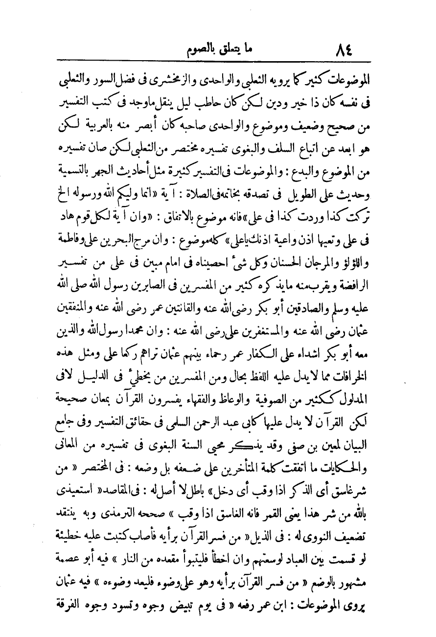 الموضوعات كثير كَمَا يرويهِ الثَّعْلَبِيّ والواحدي والزمخشري فِي فضل السُّور والثعلبي فِي نَفسه كَانَ ذَا خيرا وَدين لَكِن كَانَ حَاطِب ليل ينْقل مَا وجد فِي كتب التَّفْسِير من صَحِيح وَضَعِيف وموضوع والواحدي صَاحبه كَانَ أبْصر مِنْهُ بِالْعَرَبِيَّةِ لَكِن هُوَ أبعد عَن أَتبَاع السّلف وَالْبَغوِيّ تَفْسِيره مُخْتَصر من الثَّعْلَبِيّ لَكِن صان تَفْسِيره من الْمَوْضُوع والبدع، والموضوعات فِي التَّفْسِير كَثِيرَة مثل أَحَادِيث الْجَهْر بِالتَّسْمِيَةِ وَحَدِيث عَليّ الطَّوِيل فِي تصدقه بِخَاتمِهِ فِي الصَّلَاة: آيَة (إِنَّمَا وَلِيكُم الله وَرَسُوله) إِلَخ. وَتركت كَذَا وَردت كَذَا فِي عَليّ" فَإِنَّهُ مَوْضُوع بالِاتِّفَاقِ: «وَإِن آيَة لكل قوم هاد» فِي عَليّ وَتَعيهَا أذن وَاعِيَة أُذُنك يَا عَليّ" كُله مَوْضُوع وَإِن مرج الْبَحْرين عَليّ وَفَاطِمَة واللؤلؤ والمرجان الحسان وكل شَيْء أحصيناه فِي إِمَام مُبين فِي عَليّ من تَفْسِير الرافضة وَيقرب مِنْهُ مَا يذكرهُ كثير من الْمُفَسّرين فِي الصابرين رَسُولُ اللَّهِ صَلَّى اللَّهُ عَلَيْهِ وَسلم والصادقين أَبُو بكر رَضِي الله عَنهُ والقانتين عمر رَضِي الله عَنهُ والمنفقين عُثْمَان رَضِي الله عَنهُ والمستغفرين عَليّ رَضِي الله عَنهُ، وَأَن مُحَمَّدًا رَسُول الله وَالَّذين مَعَه أَبُو بكر أشداء على الْكفَّار عمر رحماء بَينهم عُثْمَان تراهم ركعا عَليّ وَمثل هَذِه الخرافات مِمَّا لَا يدل عَلَيْهِ اللَّفْظ بِحَال من الْمُفَسّرين من يُخطئ فِي الدَّلِيل لَا فِي الْمَدْلُول ككثير من الصُّوفِيَّة والوعاظ وَالْفُقَهَاء يفسرون الْقُرْآن بمعان صَحِيحَة لَكِن الْقُرْآن لَا يدل عَلَيْهَا كَأبي عبد الرَّحْمَن السّلمِيّ فِي حقائق التَّفْسِير وَفِي جَامع الْبَيَان لمُعين بن صفي وَقد يذكر مُحي السّنة الْبَغَوِيّ فِي تَفْسِيره من الْمعَانِي والحكايات مَا اتّفقت كلمة الْمُتَأَخِّرين على ضعفه بل وَضعه.