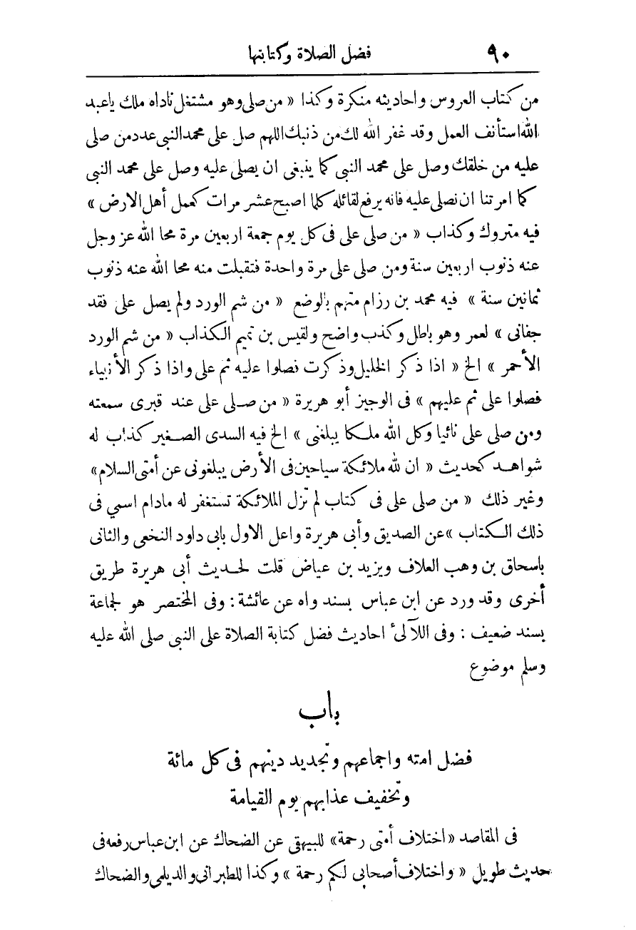 فِي الْوَجِيز أَبُو هُرَيْرَة «مَنْ صَلَّى عَلَيَّ عِنْدَ قَبْرِي سَمِعْتُهُ وَمَنْ صَلَّى عَلَيَّ نَائِيًا وكل الله ملكا يبلغنِي» إِلَخ. فِيهِ السّديّ الصَّغِير كَذَّاب لَهُ شَوَاهِد كَحَدِيث «إِنَّ لِلَّهِ مَلائِكَةً سَيَّاحِينَ فِي الأَرْضِ يُبَلِّغُونِي عَنْ أُمَّتِي السَّلامَ» وَغير ذَلِك «مَنْ صَلَّى عَلَيَّ فِي كِتَابٍ لَمْ تَزَلِ الْمَلائِكَةُ تَسْتَغْفِرُ لَهُ مَا دَامَ اسْمِي فِي ذَلِكَ الْكتاب» عَن الصّديق وَأبي هُرَيْرَة وأعل الأول بِأبي دَاوُد النَّخعِيّ وَالثَّانِي بِإسْحَاق بن وهب العلاف وَيزِيد بن عِيَاض قلت لحَدِيث أبي هُرَيْرَة طَرِيق أُخْرَى وَقد ورد عَن ابْن عَبَّاس بِسَنَد واه عَن عَائِشَة، وَفِي الْمُخْتَصر هُوَ لجَماعَة بِسَنَد ضَعِيف، وَفِي اللآلئ أَحَادِيث فضل كِتَابَة الصَّلاةُ عَلَى النَّبِيِّ صَلَّى اللَّهُ عَلَيْهِ وَسلم مَوْضُوع.