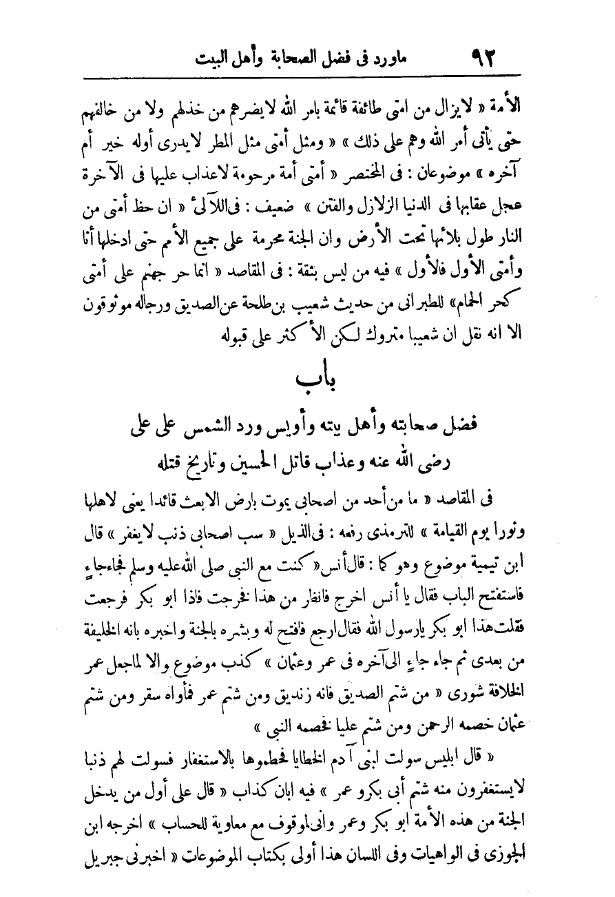 بَاب فضل صحابته وَأهل بَيته وأويس ورد الشَّمْس على عَليّ رَضِي الله عَنهُ وَعَذَاب قَاتل الْحُسَيْن وتاريخ قَتله.
