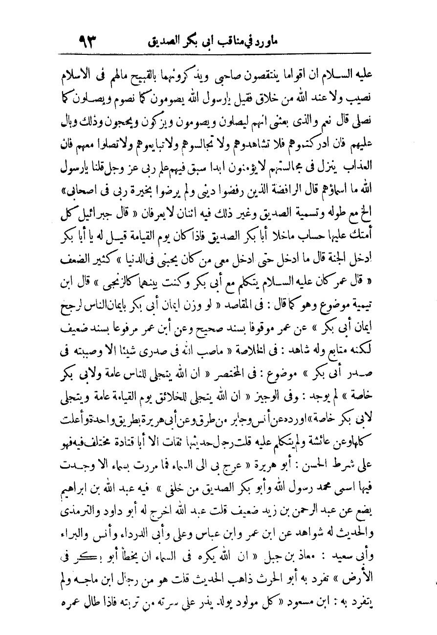أَبُو هُرَيْرَة «عرج بِي السَّمَاء فَمَا مَرَرْتُ بِسَمَاءٍ إِلا وَجَدْتُ فِيهَا اسْمِي مُحَمَّدٌ رَسُولُ اللَّهِ وَأَبُو بكر الصّديق من خَلْفي» فِيهِ عبد الله بن إِبْرَاهِيم يضع عَن عبد الرَّحْمَن بن زيد ضَعِيف قلت عبد الله أخرج لَهُ أَبُو دَاوُد وَالتِّرْمِذِيّ والْحَدِيث لَهُ شَوَاهِد عَن ابْن عمر وَابْن عَبَّاس وَعلي وَأبي الدَّرْدَاء وَأنس والبراء وَأبي سعيد.