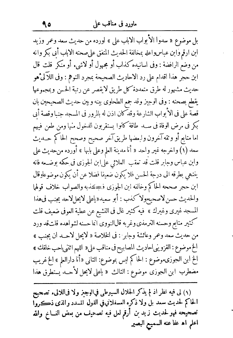 «سُدُّوا الأَبْوَابَ إِلا بَابَ عَلِيٍّ» أوردهُ من حَدِيث سعد وَعمر وَزيد ابْن أَرقم وَابْن عَبَّاس وَأعله بمخالفة الحَدِيث الْمُتَّفق على صِحَّته إِلَّا بَاب أبي بكر وَأَنه من وضع الرافضة، وَفِي أسانيده كَذَّاب أَو مَجْهُول أَو لَا شَيْء أَو مُنكر قلت قَالَ ابْن حجر هَذَا أَقْدَام على رد الْأَحَادِيث الصَّحِيحَة بِمُجَرَّد التَّوَهُّم، وَفِي اللآلئ هُوَ حَدِيث مَشْهُور لَهُ طرق مُتعَدِّدَة كل طَرِيق لَا يقصر عَن رُتْبَة الْحسن وبمجموعها يقطع بِصِحَّتِهِ، وَفِي الْوَجِيز وَقد جمع الطَّحَاوِيّ بَينه وَبَين حَدِيث الصَّحِيحَيْنِ بِأَن قصَّة عَليّ فِي الْأَبْوَاب الشارعة وَكَانَ إِذن لَهُ بالمرور فِي الْمَسْجِد جنبا وقصة أبي بكر فِي مرض الْوَفَاة فِي سد طَاقَة كَانُوا يستقربون الدُّخُول مِنْهَا وَمن طعن فيهم أما متابع أَو وَثَّقَهُ آخَرُونَ ولبعضها طَرِيق آخر صَحِيح وَصحح الْحَاكِم حَدِيث سعد (¬1) وَأخرجه غير وَاحِد.