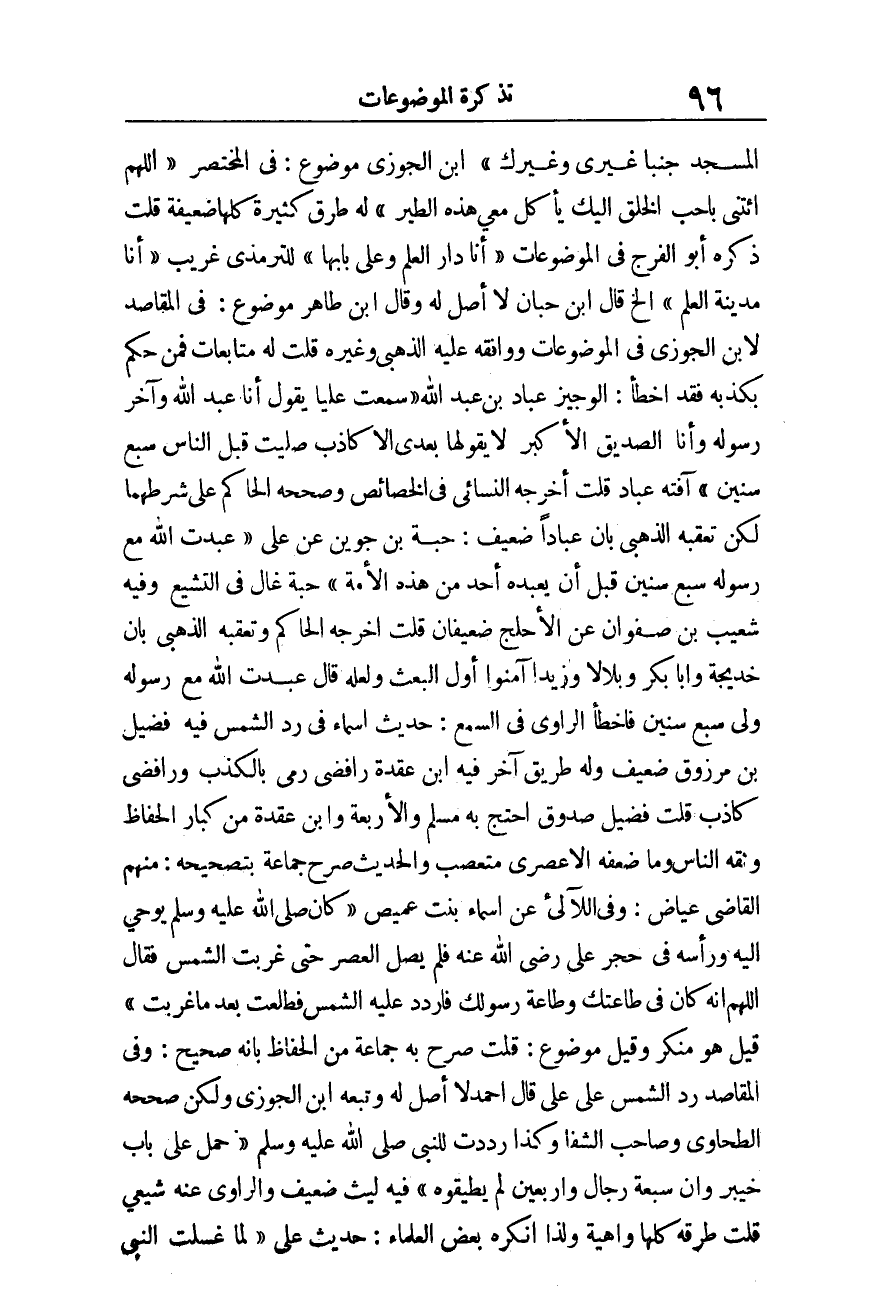حَدِيث أَسمَاء فِي رد الشَّمْس فِيهِ فُضَيْل بن مَرْزُوق ضَعِيف وَله طَرِيق آخر فِيهِ ابْن عقدَة رَافِضِي رمي بِالْكَذِبِ ورافضي كَاذِب قلت فُضَيْل صَدُوق احْتج بِهِ مُسلم وَالْأَرْبَعَة وَابْن عقدَة من كبار الْحفاظ وَثَّقَهُ النَّاس وَمَا ضعفه إِلَّا عصري متعصب والْحَدِيث صرح جمَاعَة بِتَصْحِيحِهِ: مِنْهُم القَاضِي عِيَاض، وَفِي اللآلئ عَن أَسمَاء بنت عميص «كَانَ صَلَّى اللَّهُ عَلَيْهِ وَسَلَّمَ يوحي إِلَيْهِ وَرَأسه فِي حجر عَليّ رَضِي الله عَنهُ فَلم يصل الْعَصْر حَتَّى غربت الشَّمْس فَقَالَ اللَّهُمَّ إِنَّه كَانَ فِي طَاعَتك وَطَاعَة رَسُولك فاردد عَلَيْهِ الشَّمْس فطلعت بعد مَا غربت» قيل هُوَ مُنكر وَقيل مَوْضُوع: قلت صرح بِهِ جمَاعَة من الْحفاظ بِأَنَّهُ صَحِيح، وَفِي الْمَقَاصِد رد الشَّمْس على عَليّ قَالَ أَحْمد لَا أصل لَهُ وَتَبعهُ ابْن الْجَوْزِيّ وَلَكِن صَححهُ الطَّحَاوِيّ وَصَاحب الشفا وَكَذَا رددت للنَّبِي صلى الله عَلَيْهِ وَسلم.