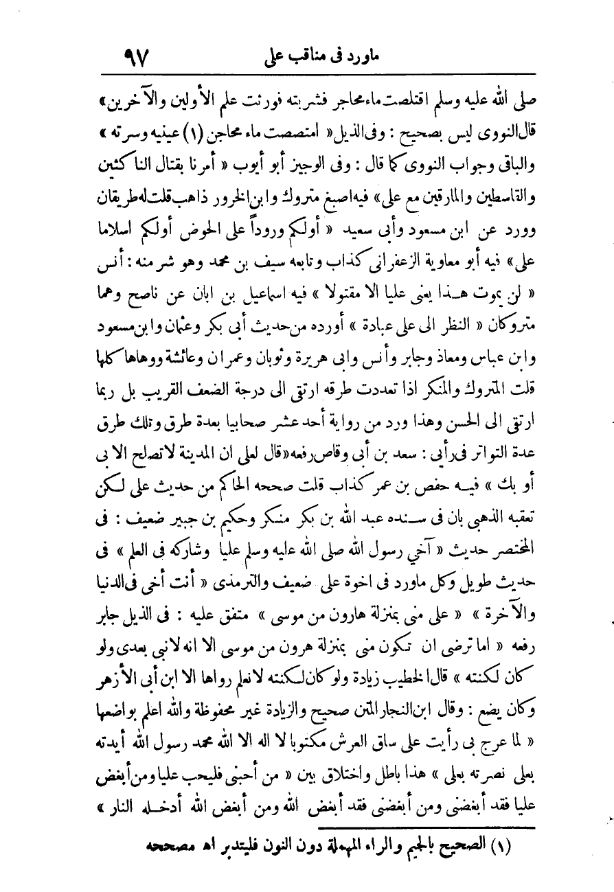 وَفِي الْوَجِيز أَبُو أَيُّوب «أُمِرْنَا بِقِتَالِ النَّاكِثِينَ الْقَاسِطِينَ وَالْمَارِقِينَ مَعَ عَليّ» فِيهِ إصبغ مَتْرُوك وَابْن الخرور ذَاهِب قلت لَهُ طَرِيقَانِ وَورد عَن ابْن مَسْعُود وَأبي سعيد «أَوَّلُكُمْ وُرُودًا عَلَيَّ الْحَوْضَ أَوَّلُكُمْ إسلاما عَليّ» فِيهِ أَبُو مُعَاوِيَة الزَّعْفَرَانِي كَذَّاب وَتَابعه سيف بن مُحَمَّد وَهُوَ شَرّ مِنْهُ.