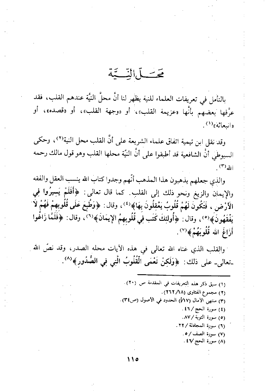 وقد نقل ابن تيمية اتفاق علماء الشريعة على أنَّ القلب محل النية (¬2)، وحكى السيوطي أنَّ الشافعية قد أطبقوا على أن النيّة محلها القلب وهو قول مالك رحمه الله (¬3).