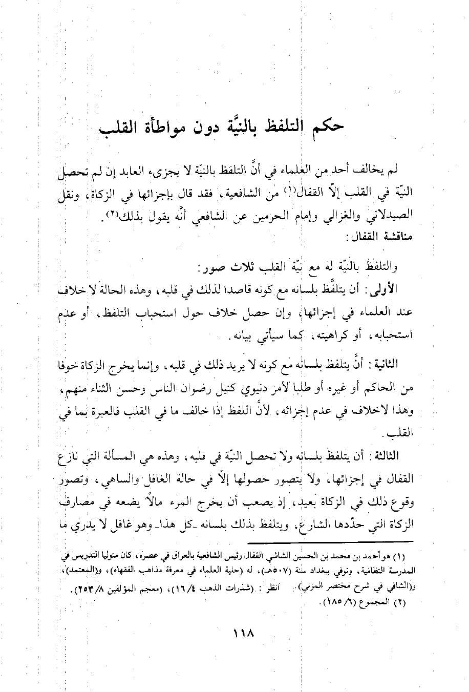 لم يخالف أحد من العلماء في أن التلفظ بالنيّة لا يجزىء العابد إن لم تحصل النيّة في القلب إلاّ القفال (¬1) من الشافعية، فقد قال بإجزائها في الزكاة، ونقل الصيدلاني والغزالي وإمام الحرمين عن الشافعي أنه يقول بذلك (¬2).