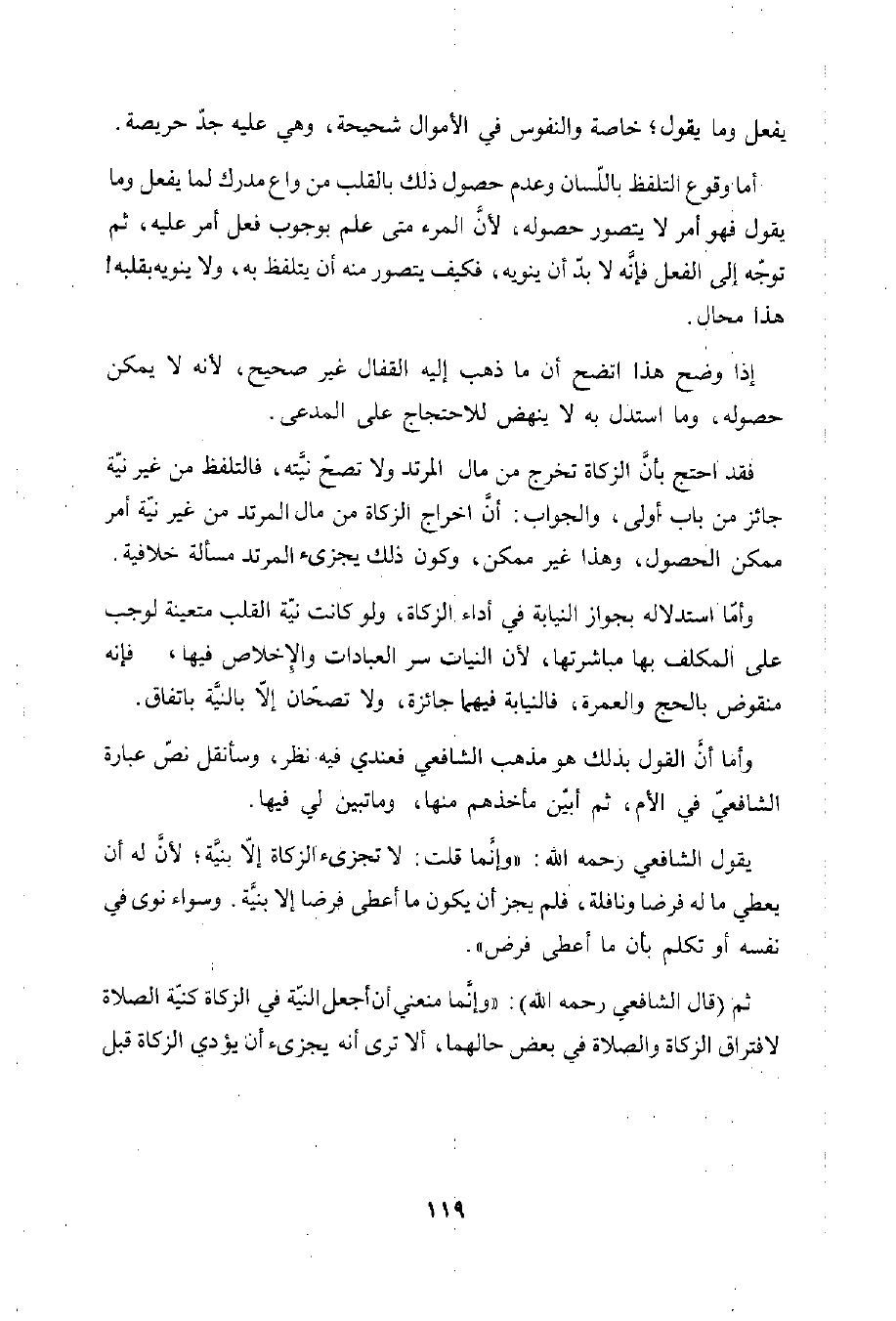 يفعل وما يقول؛ خاصة والنفوس في الأموال شحيحة، وهي عليه جدّ حريصة. أما وقوع التلفظ باللّسان وعدم حصول ذلك بالقلب من واع مدرك لما يفعل وما يقول فهو أمر لا يتصور حصوله، لأنَّ المرء متى علم بوجوب فعل أمر عليه، ثم توجّه إلى الفعل فإنَّه لا بد أن ينويه، فكيف يتصور منه أن يتلفظ به، ولا ينويه بقلبه! هذا محال.