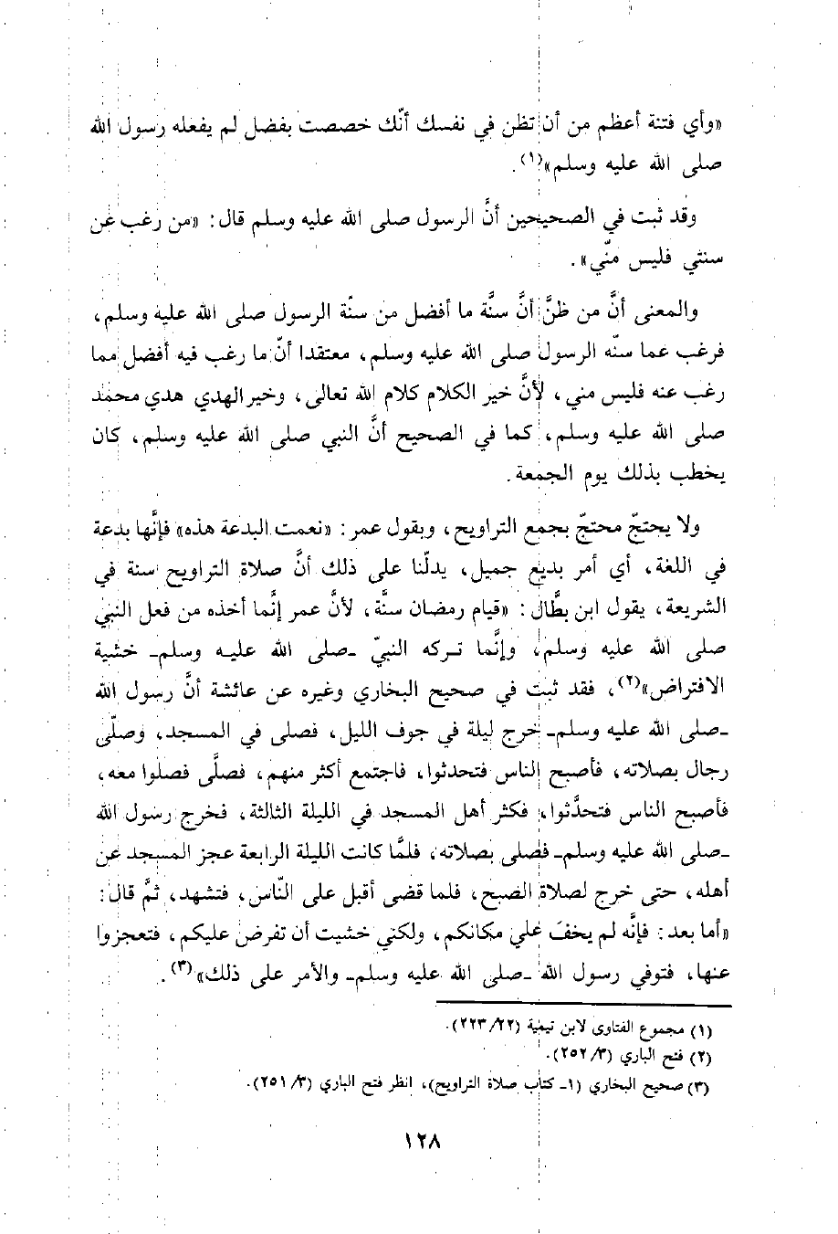 ولا يحتجّ محتجّ بجمع التراويح، وبقول عمر: "نعمت البدعة هذه" فإنَّها بدعة في اللغة، أي أمر بديع جميل، يدلّنا على ذلك أنَّ صلاة التراويح سنة في الشريعة، يقول ابن بطَّال: "قيام رمضان سنَّة، لأنَّ عمر إنَّما أخذه من فعل النبي صلى الله عليه وسلم، وإنَّما تركه النبيّ -صلى الله عليه وسلم- خشية الافتراض" (¬2)، فقد ثبت في صحيح البخاري وغيره عن عائشة أنَّ رسول الله -صلى الله عليه وسلم- خرج ليلة في جوف الليل، فصلى في المسجد، وصلّى رجال بصلاته، فأصبح الناس فتحدثوا، فاجتمع أكثر منهم، فصلَّى فصلوا معه، فأصبح الناس فتحدَّثوا، فكثر أهل المسجد في الليلة الثالثة، فخرج رسول الله -صلى الله عليه وسلم- فصلى بصلاته، فلمَّا كانت الليلة الرابعة عجز المسجد عن أهله، حتى خرج لصلاة الصبح، فلما قضى أقبل على النّاس، فتشهد، ثمَّ قال: "أما بعد: فإنه لم يخفَ علي مكانكم، ولكني خشيت أن تفرض عليكم، فتعجزوا عنها، فتوفي رسول الله -صلى الله عليه وسلم- والأمر على ذلك" (¬3).