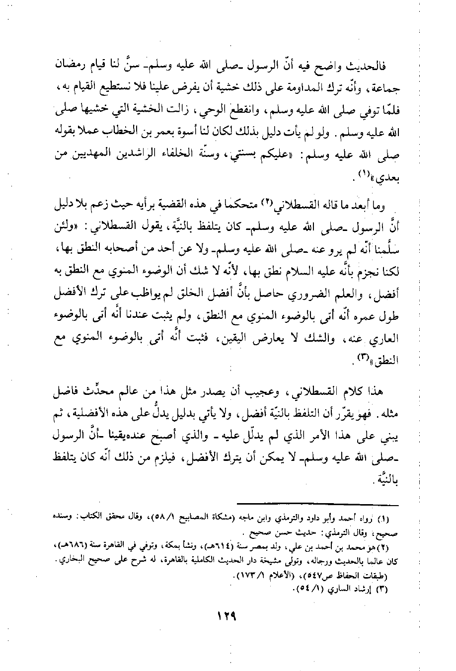 وما أبعد ما قاله القسطلاني (¬2) متحكما في هذه القضية برأيه حيث زعم بلا دليل أنَّ الرسول -صلى الله عليه وسلم- كان يتلفظ بالنية، يقول القسطلاني: "ولئن سلمنا أنّه لم يرو عنه -صلى الله عليه وسلم- ولا عن أحد من أصحابه النطق بها، لكنا نجزم بأنَّه عليه السلام نطق بها، لأنّه لا شك أن الوضوء المنوي مع النطق به أفضل، والعلم الضروري حاصل بأن أفضل الخلق لم يواظب على ترك الأفضل طول عمره أنّه أتى بالوضوء المنوي مع النطق، ولم يثبت عندنا أنَّه أتى بالوضوء العاري عنه، والشك لا يعارض اليقين، فثبت أنّه أتى بالوضوء المنوي مع النطق" (¬3).