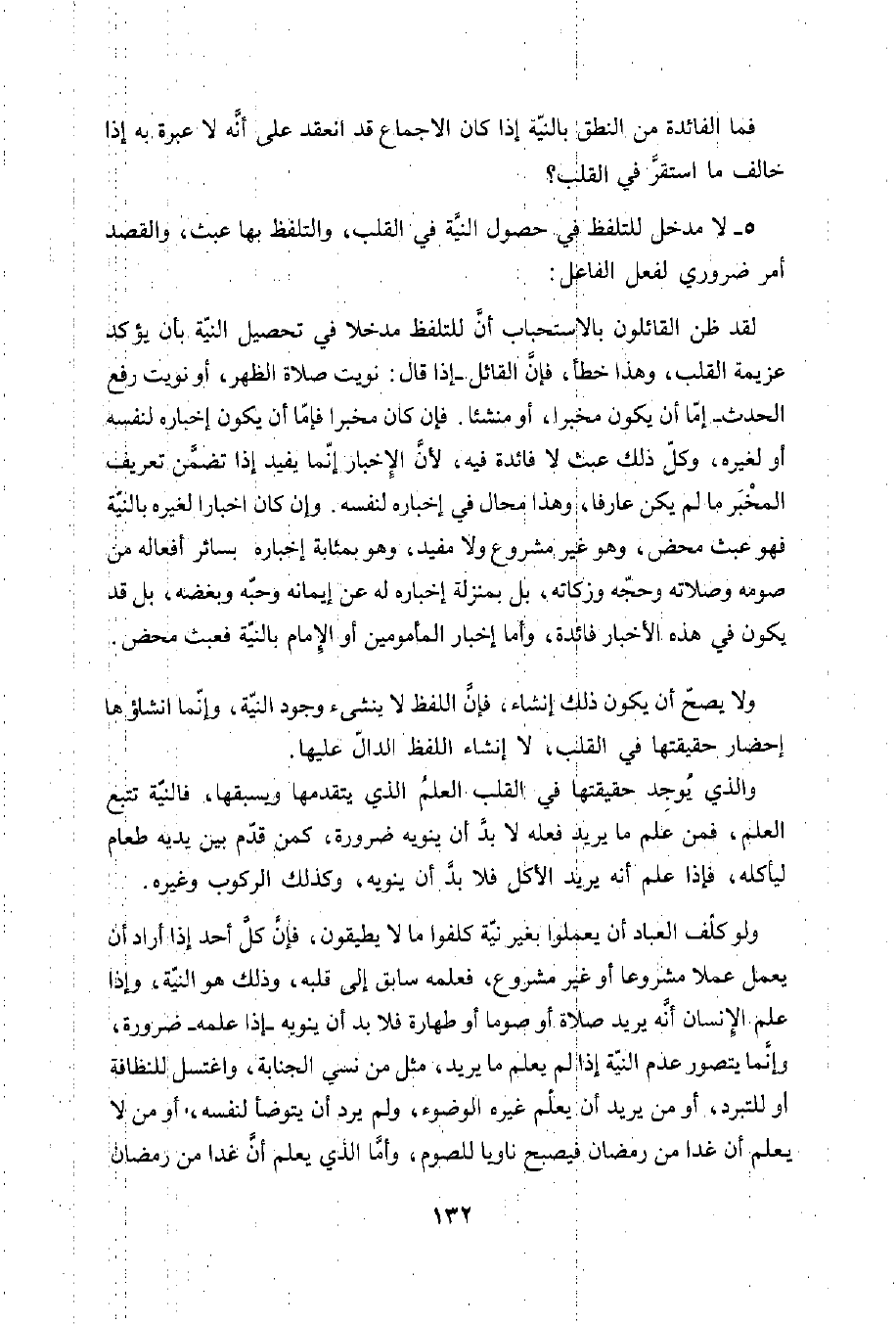 5 - لا مدخل للتلفظ في حصول النية في القلب، والتلفظ بها عبث، والقصد أمر ضروري لفعل الفاعل: