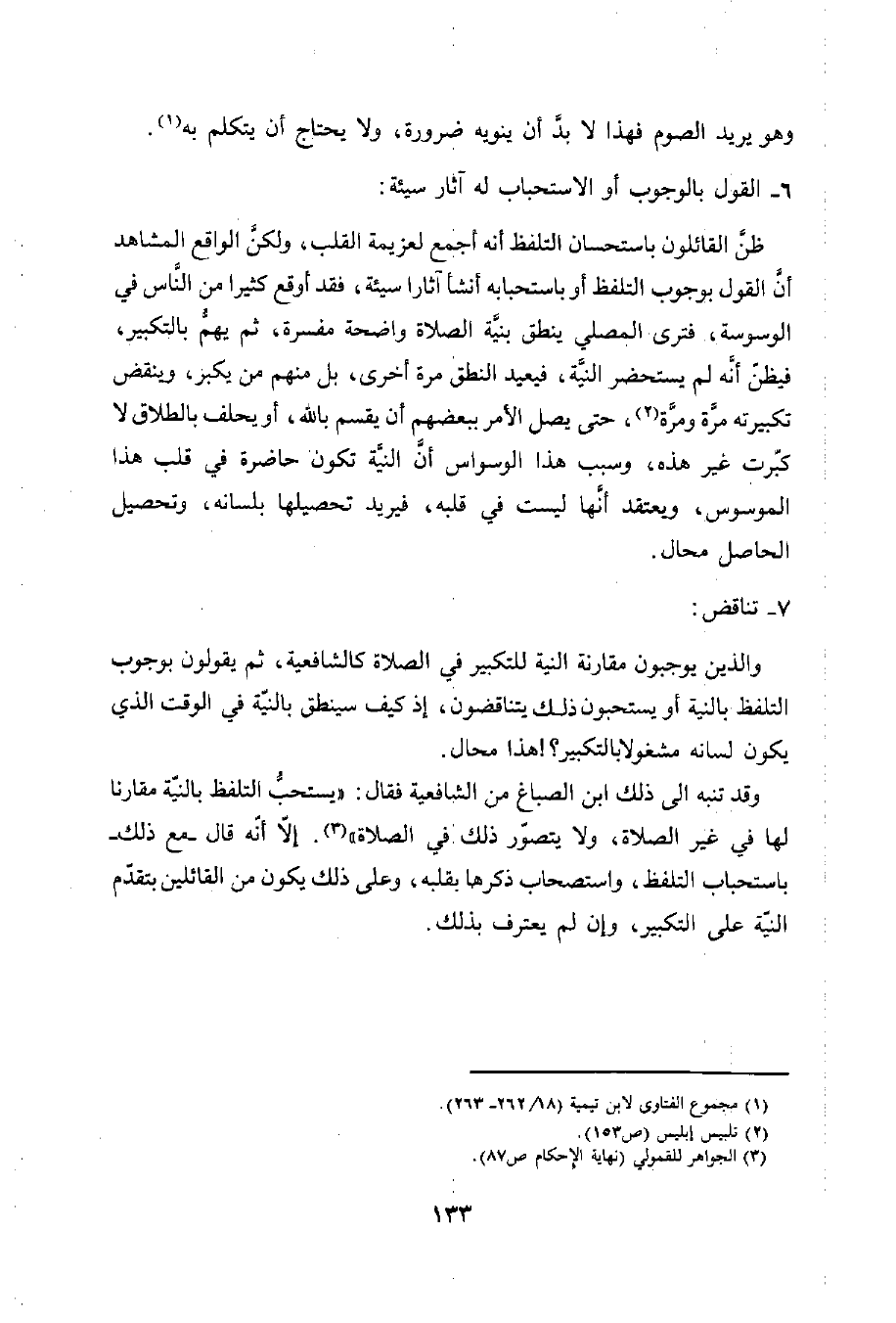 ظن القائلون باستحسان التلفظ أنه أجمع لعزيمة القلب، ولكن الواقع المشاهد أن القول بوجوب التلفظ أو باستحبابه أنشأ آثارا سيئة، فقد أوقع كثيرا من النّاس في الوسوسة، فترى المصلي ينطق بنيَّة الصلاة واضحة مفسرة، ثم يهم بالتكبير، فيظن أنَّه لم يستحضر النية، فيعيد النطق مرة أخرى، بل منهم من يكبر، وينقض تكبيرته مرَّة ومرَّة (¬2)، حتى يصل الأمر ببعضهم أن يقسم بالله، أو يحلف بالطلاق لا كبّرت غير هذه، وسب هذا الوسواس أن النية تكون حاضرة في قلب هذا الموسوس، ويعتقد أنَّها ليست في قلبه، فيريد تحصيلها بلسانه، وتحصيل الحاصل محال.