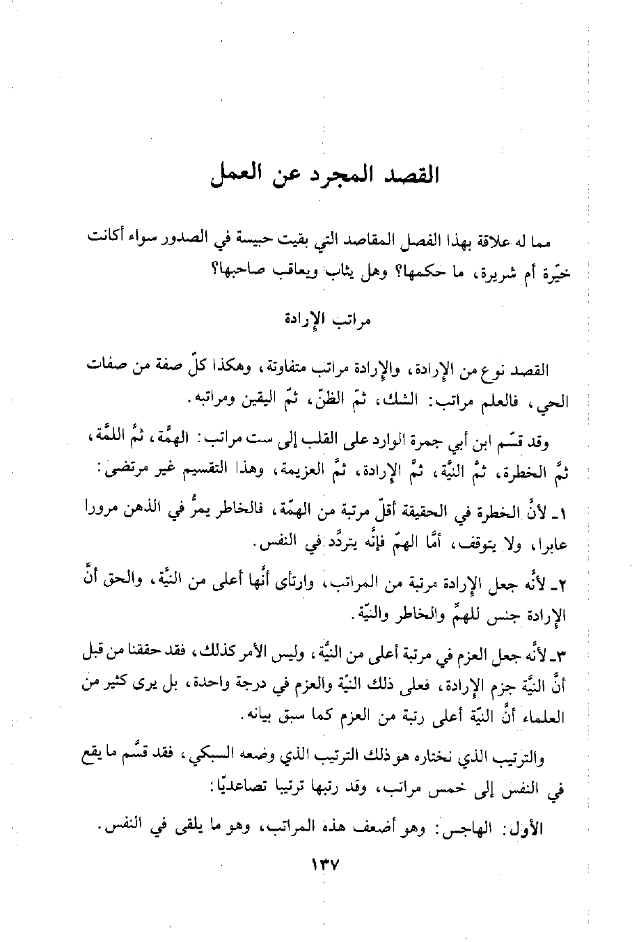 2 - لأنَّه جعل الِإرادة مرتبة من المراتب، وارتأى أنها أعلى من النية، والحق أن الإرادة جنس للهمِّ والخاطر والنيّة.