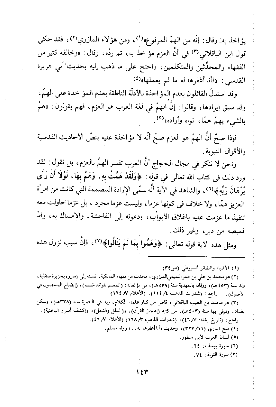 ونحن لا ننكر في مجال الحجاج أنَّ العرب تفسر الهم بالعزم، بل نقول: لقد ورد ذلك في كتاب الله تعالى في قوله: {وَلَقَدْ هَمَّتْ بِهِ وَهَمَّ بِهَا لَوْلَا أَنْ رَأَى بُرْهَانَ رَبِّهِ} (¬6)، والشاهد في الآية أنه سمّى الإِرادة المصممة التي كانت من امرأة العزيز هما، ولا خلاف في كونها عزما، وليست عزما مجردا، بل عزما حاولت معه تنفيذ ما عزمت عليه بإغلاق الأبواب، ودعوته إلى الفاحشة، والإِمساك به، وقد قميصه من دبر، وغير ذلك.